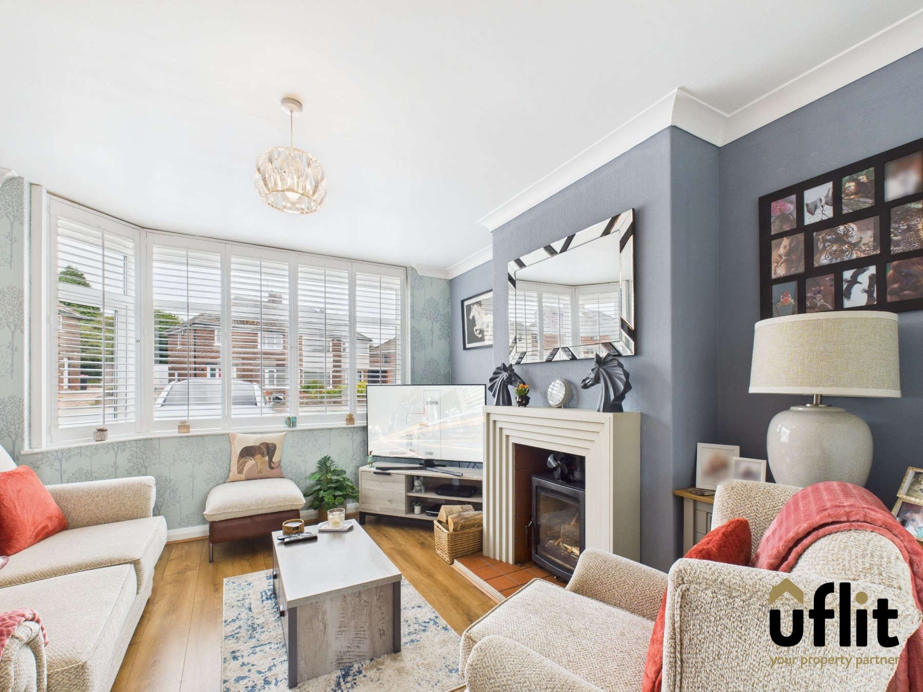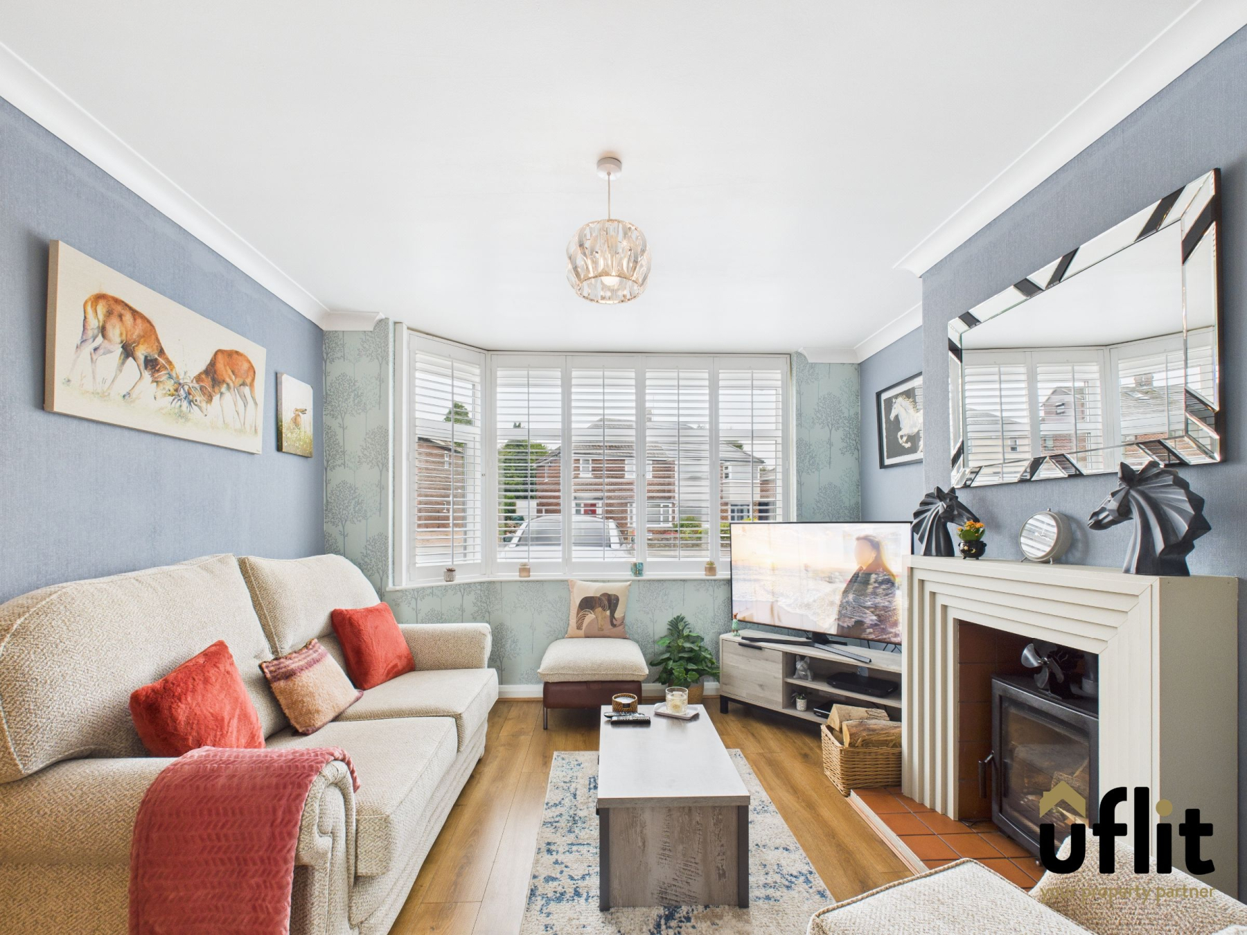 To the front of the property sits a spacious and inviting living room, flooded with light through a large front-facing window. The laminate flooring continues and a stylish working log burner provides a beautiful focal point, perfect for cosy evenings. A decorative mantel enhances the character of this delightful space.