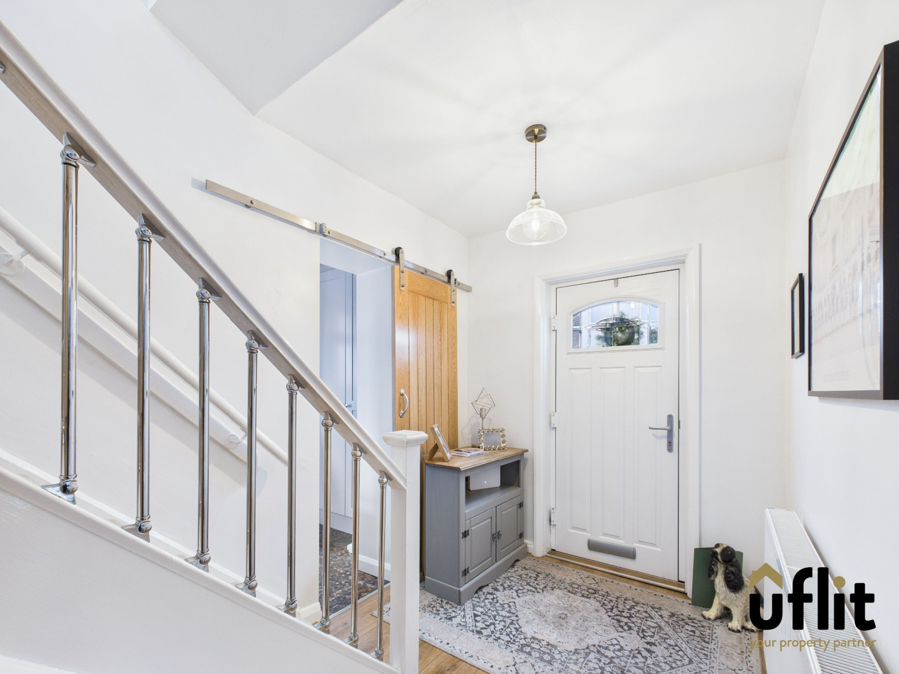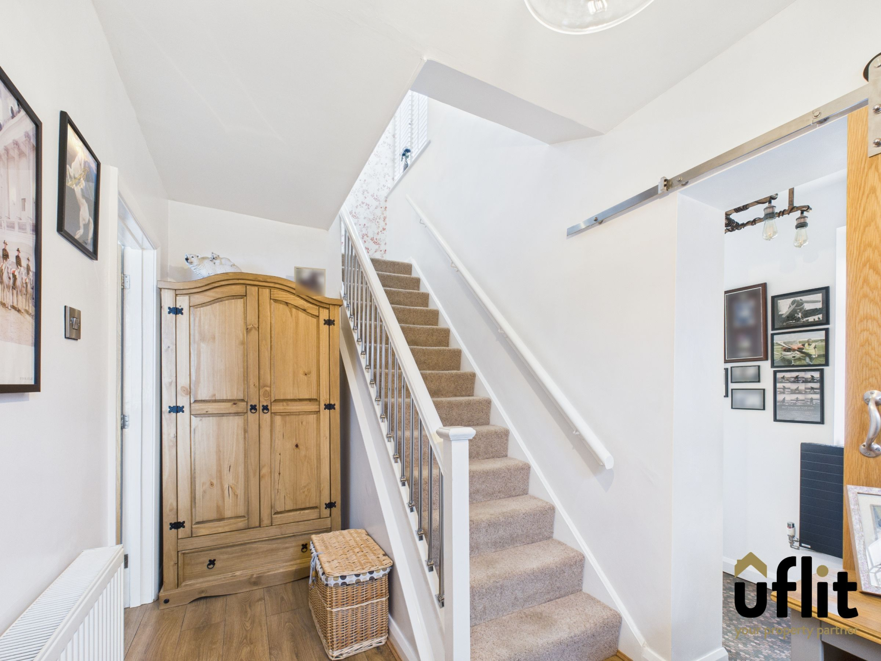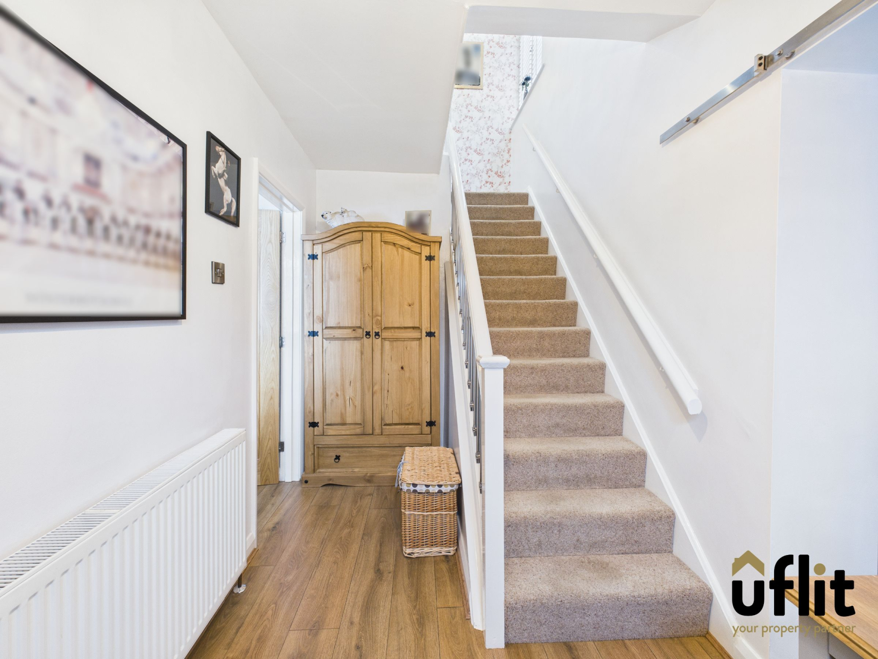 On entering the home, you're greeted by a warm and stylish entrance hallway, where carpeted stairs rise to the first floor, complemented by a modern metal balustrade. The hallway features laminate flooring that continues seamlessly into the living areas, creating a sense of flow. A sliding door opens to a convenient downstairs WC.