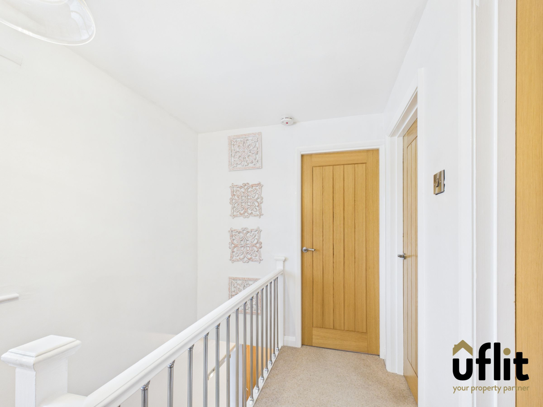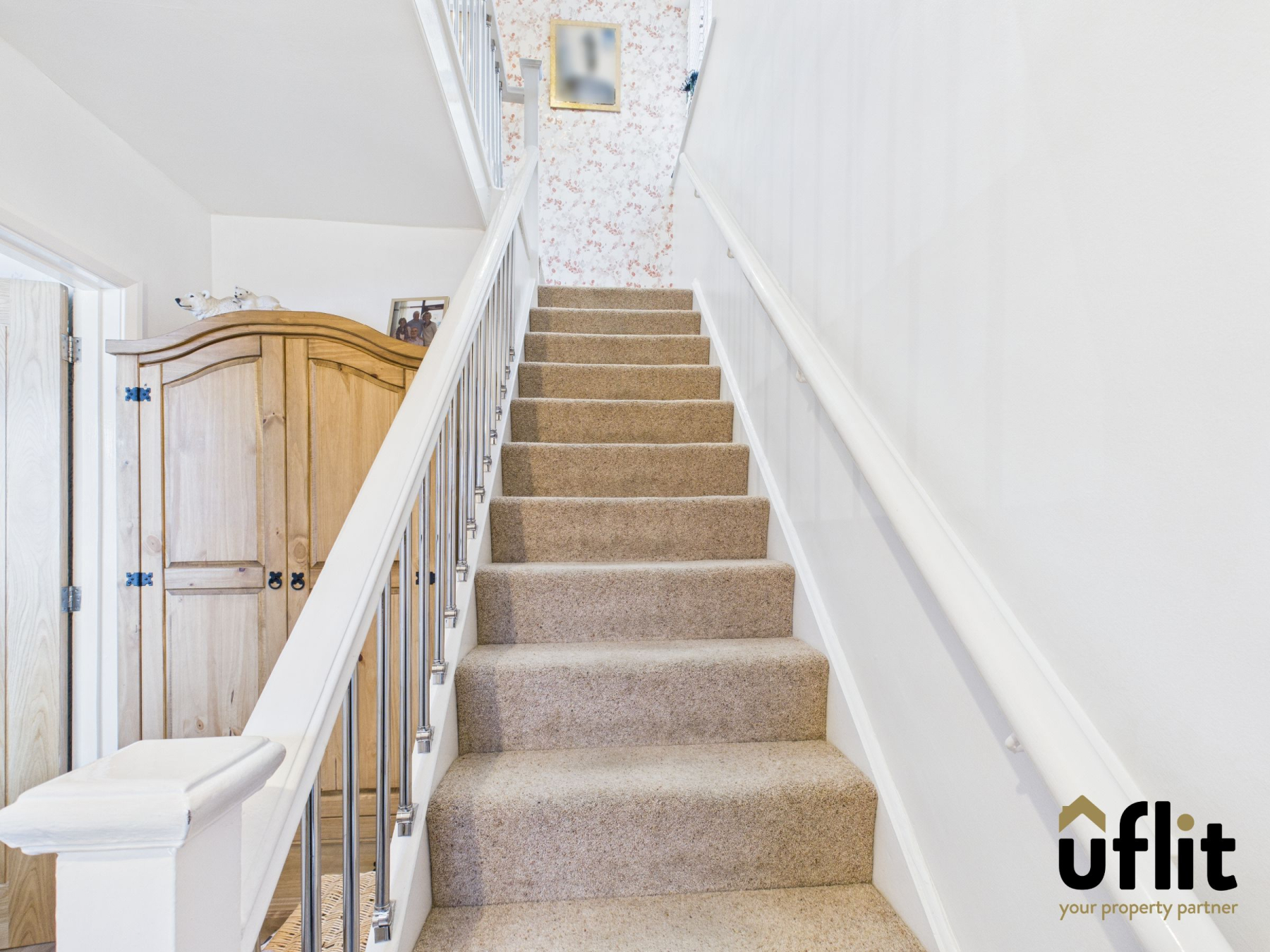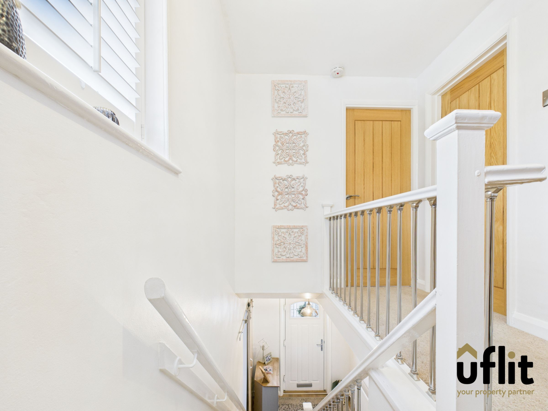 On entering the home, you're greeted by a warm and stylish entrance hallway, where carpeted stairs rise to the first floor, complemented by a modern metal balustrade. The hallway features laminate flooring that continues seamlessly into the living areas, creating a sense of flow. A sliding door opens to a convenient downstairs WC.