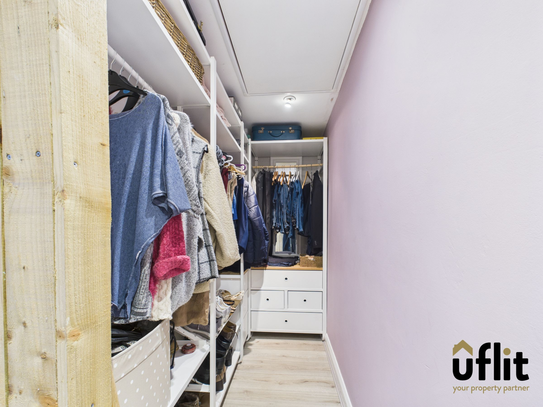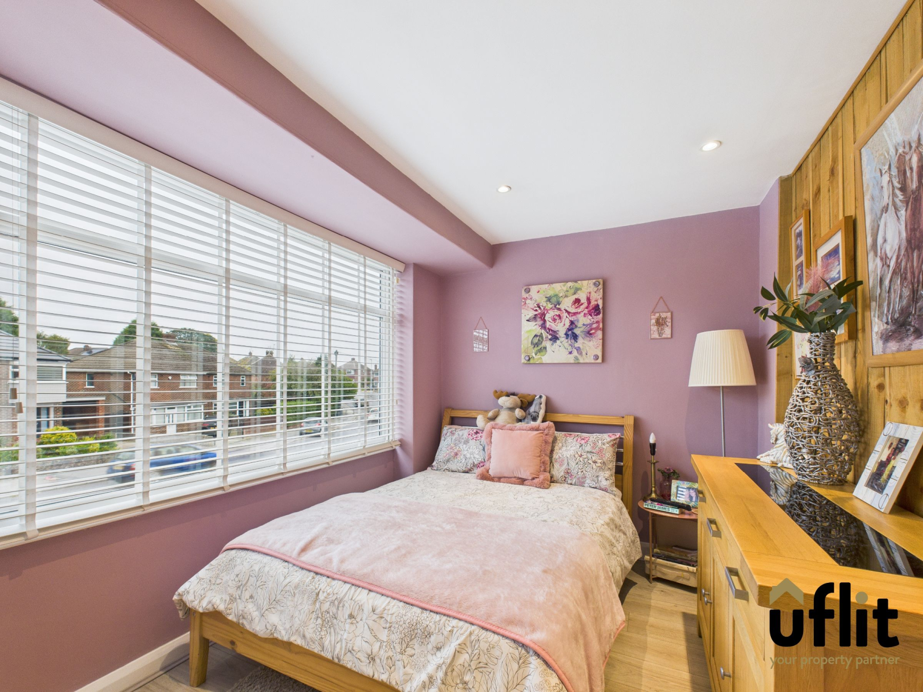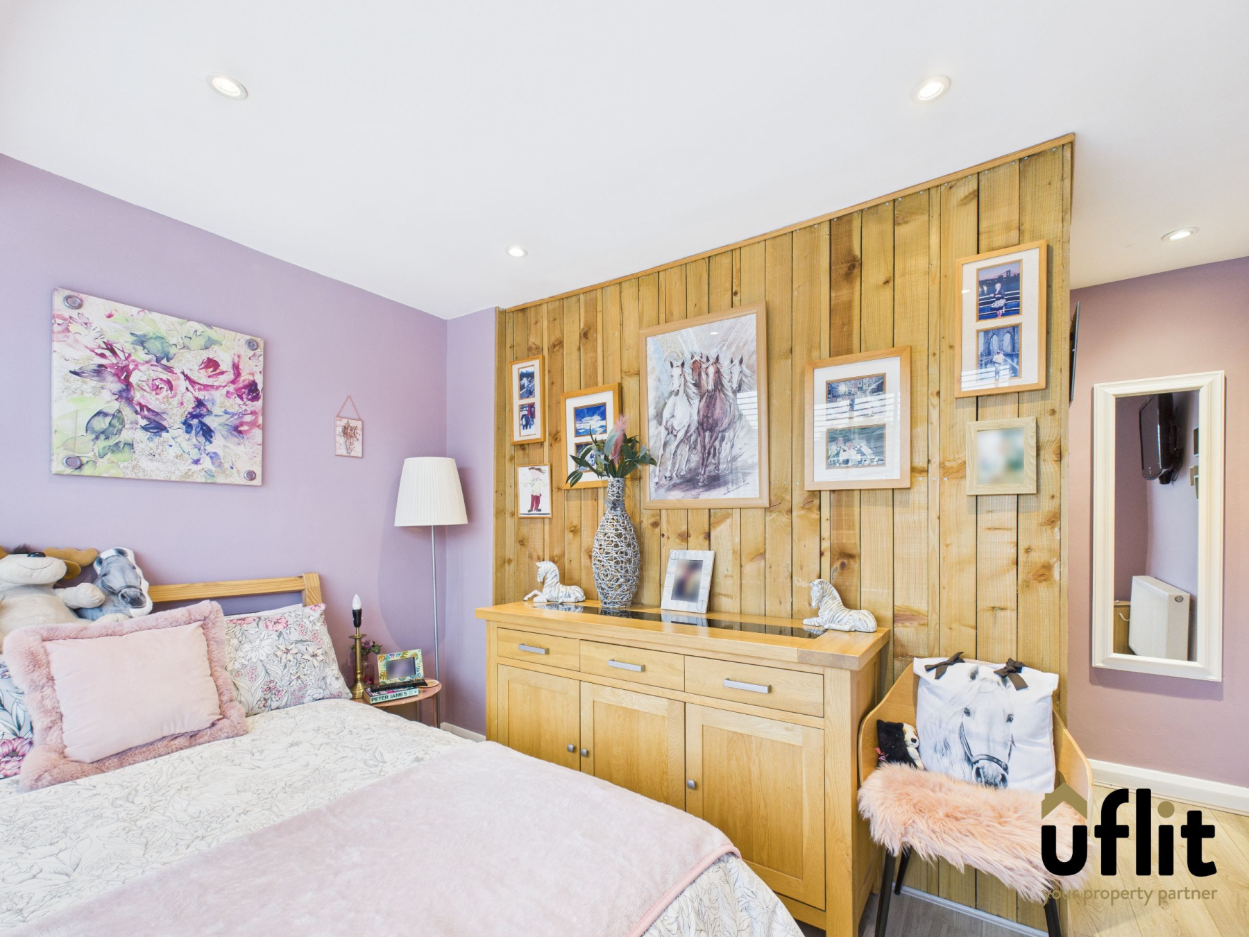 Another spacious double bedroom situated to the front of the property, featuring a front-facing window, a radiator and stylish laminate flooring. This room also benefits from bespoke, built-in wooden wardrobes offering ample storage.