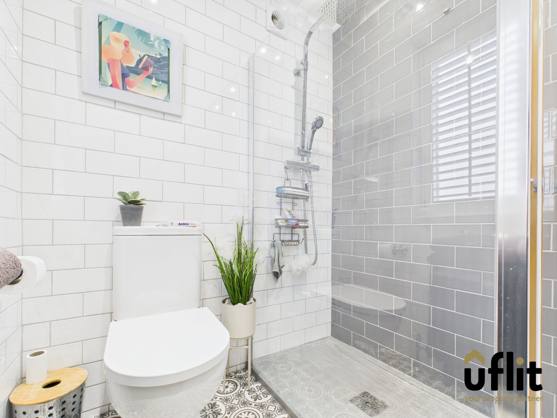 A modern and fully tiled family shower room offers a clean and stylish finish. The space comprises a low-level WC, a basin with integrated vanity unit, a rear-facing window, radiator and modern vinyl flooring. A dual-headed shower adds a touch of luxury, completing this well-appointed shower room.