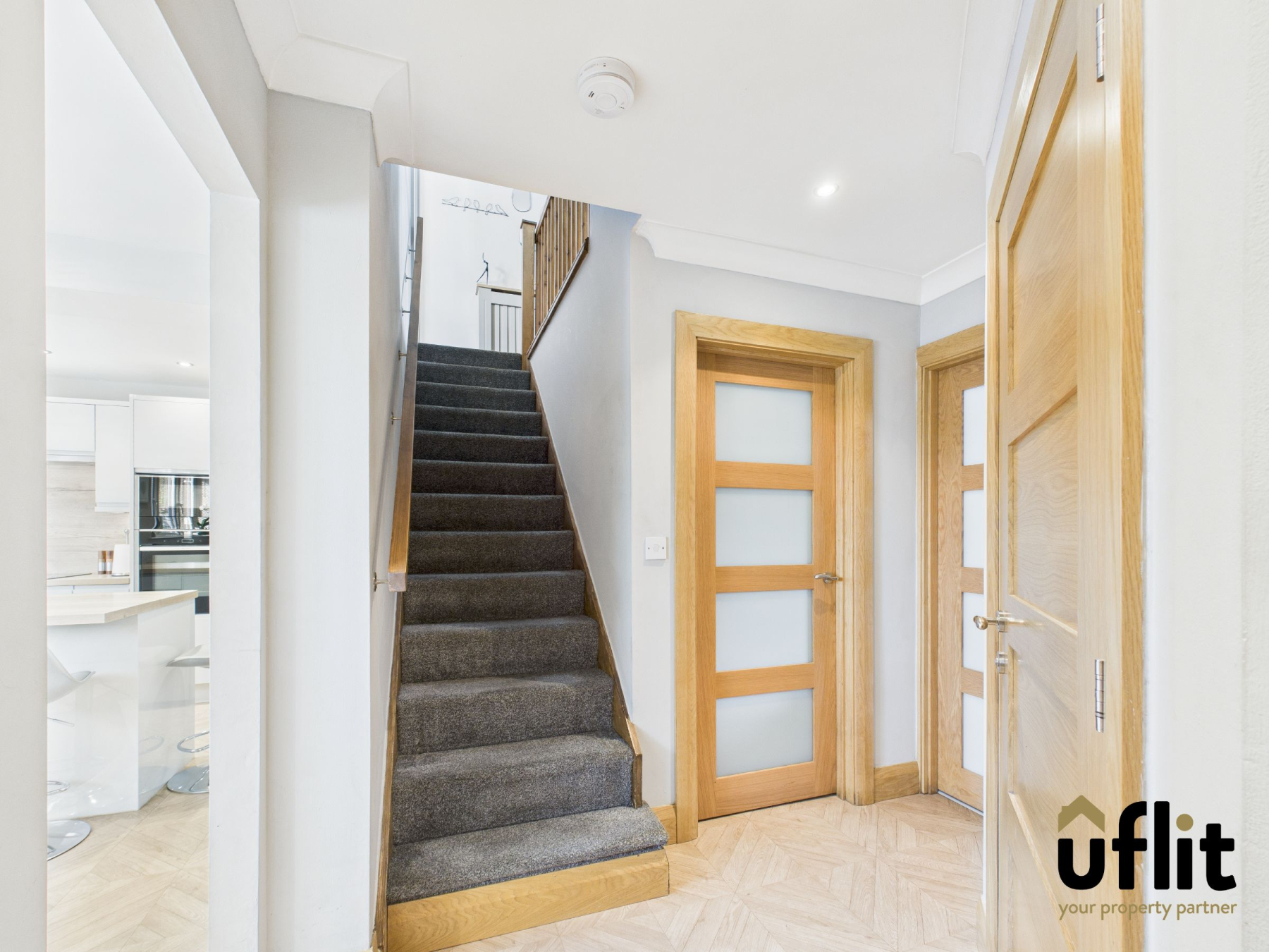 A warm and welcoming hallway featuring LVT flooring, spotlights and oak internal doors providing access to the kitchen, living room, open-plan dining/conservatory, downstairs WC and storage cupboard. Carpeted stairs rise to the first floor.