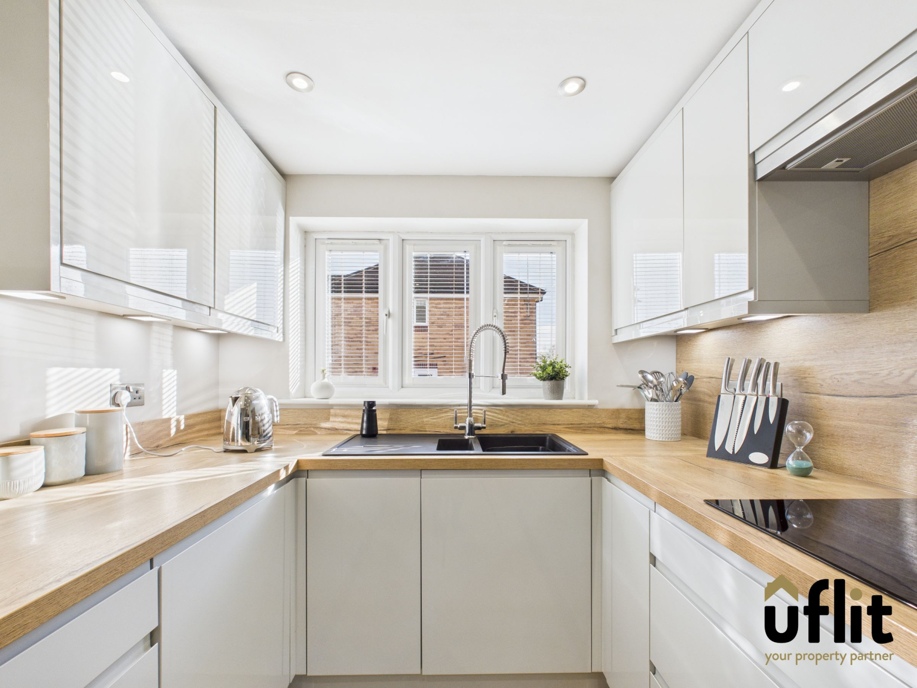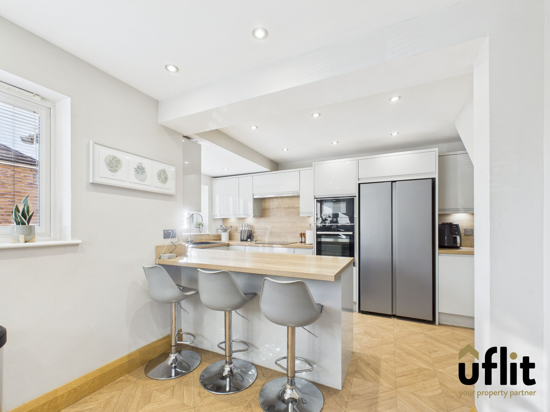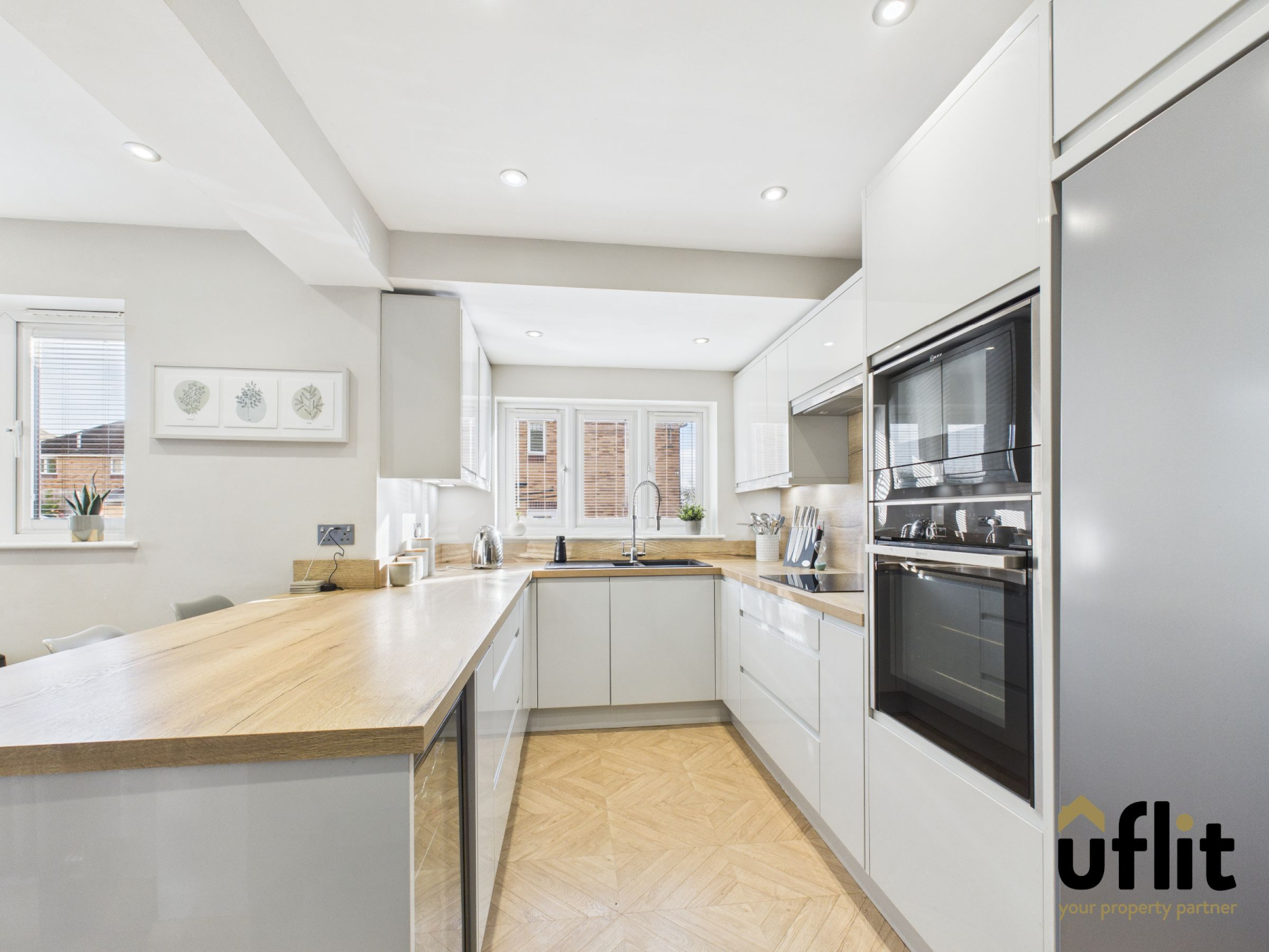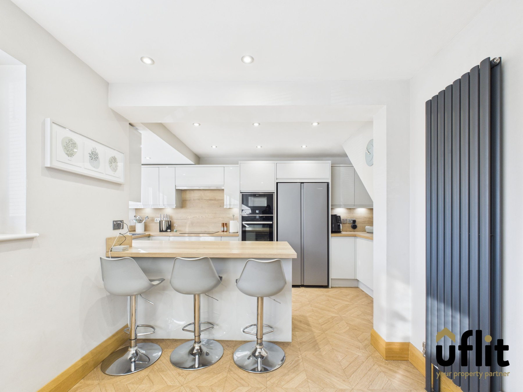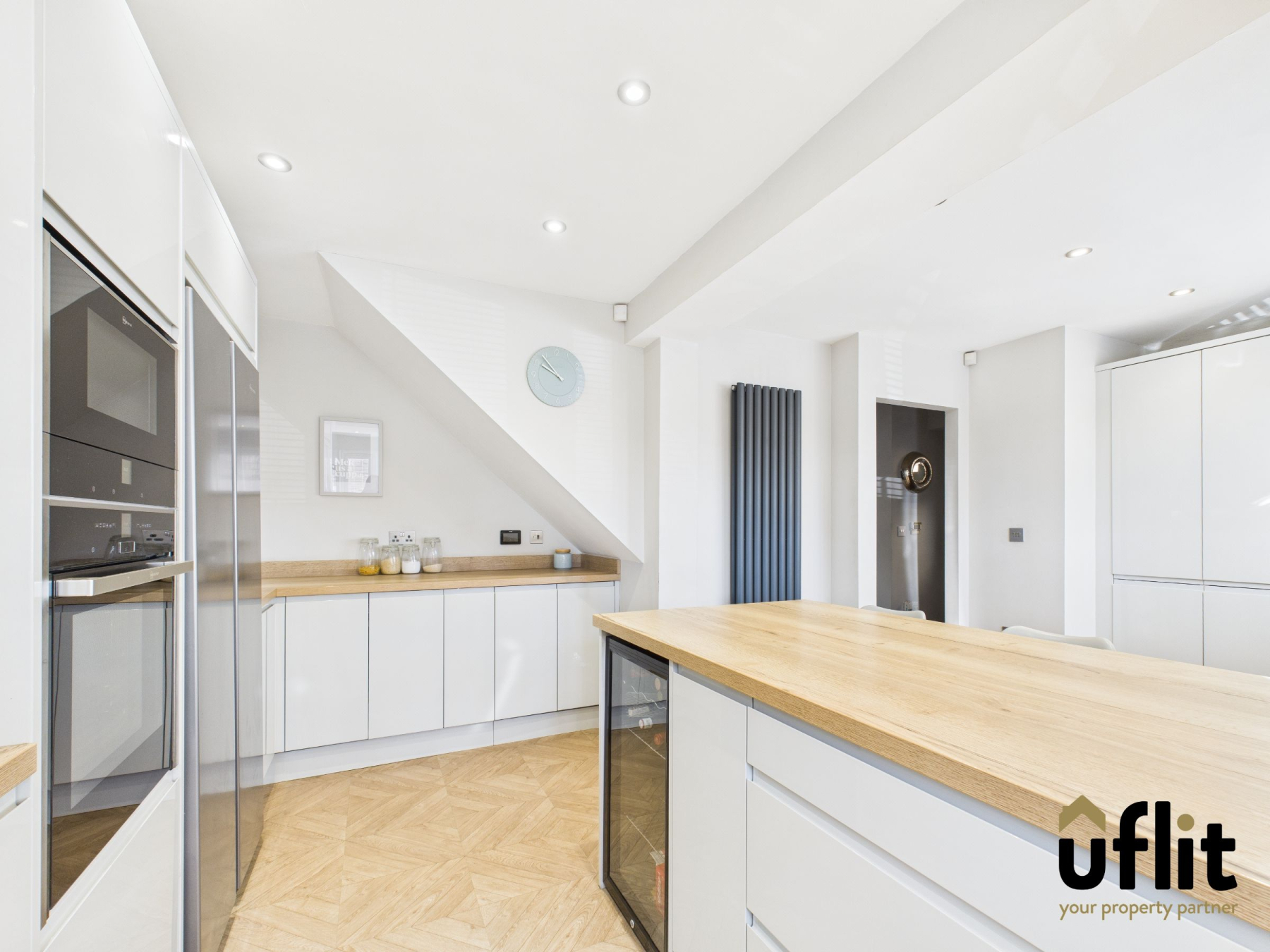 A stunning contemporary kitchen featuring a full range of high-gloss floor-to-ceiling wall and base units with further base units complemented by wood-effect laminate worktops and splash backs. The kitchen boasts integrated NEFF appliances including a slide-and-hide oven, microwave, induction hob, extractor fan, dishwasher and wine cooler, along with space for an American-style fridge freezer. Finished with LVT flooring, modern radiator, spotlights and a front-facing window allowing ample natural light.