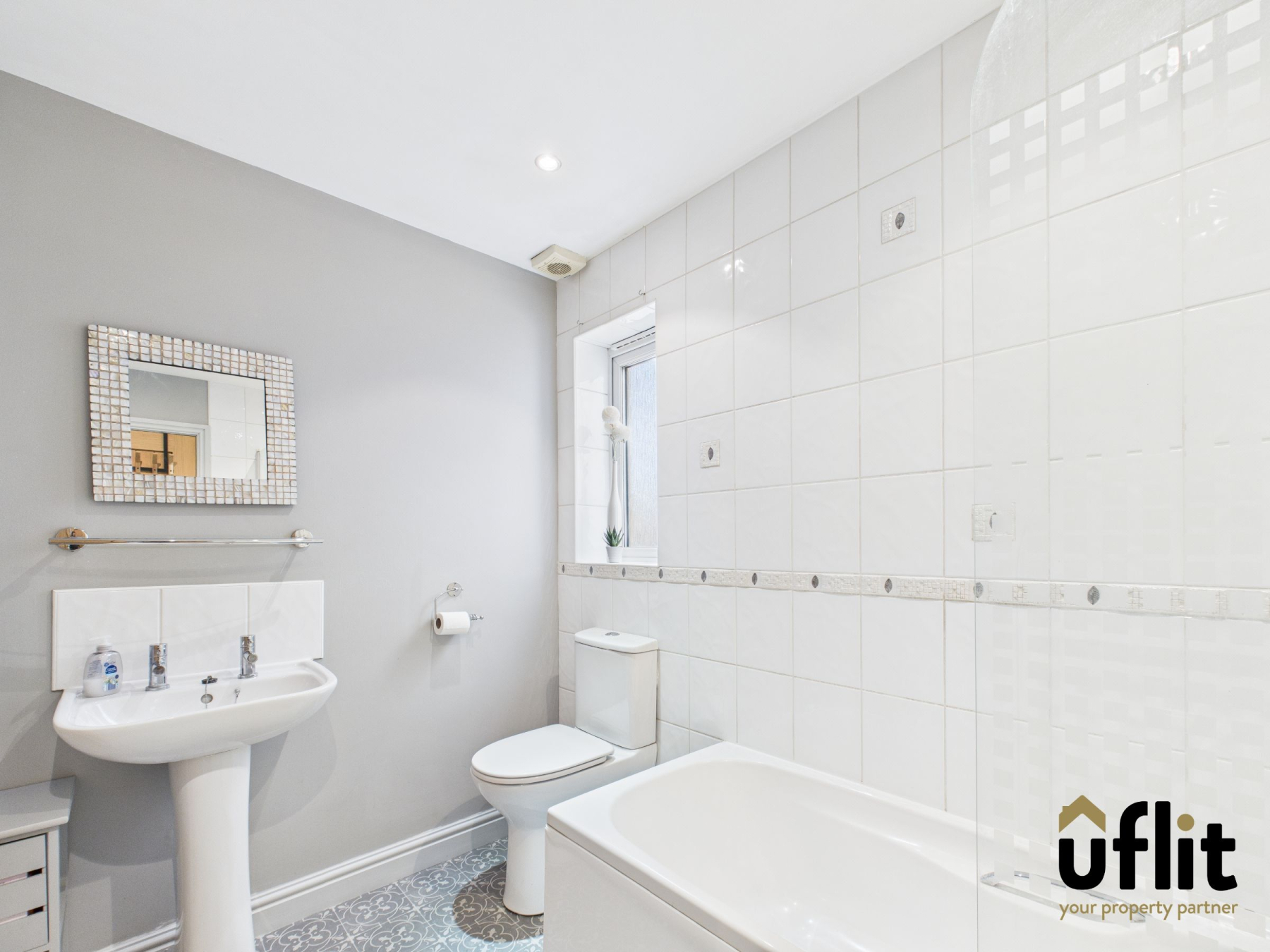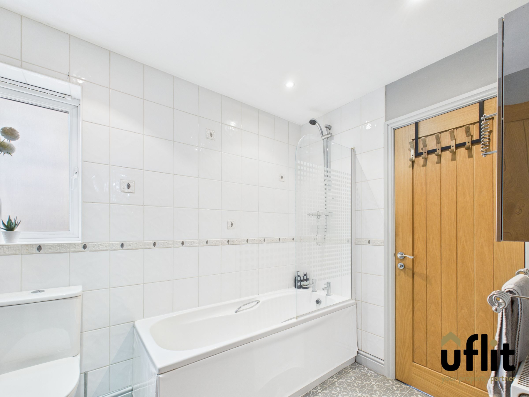 A modern and functional family bathroom comprising a panelled bath with shower and glass screen, low-level WC, wash basin with tiled splashback, radiator, vinyl flooring and a side-facing window.