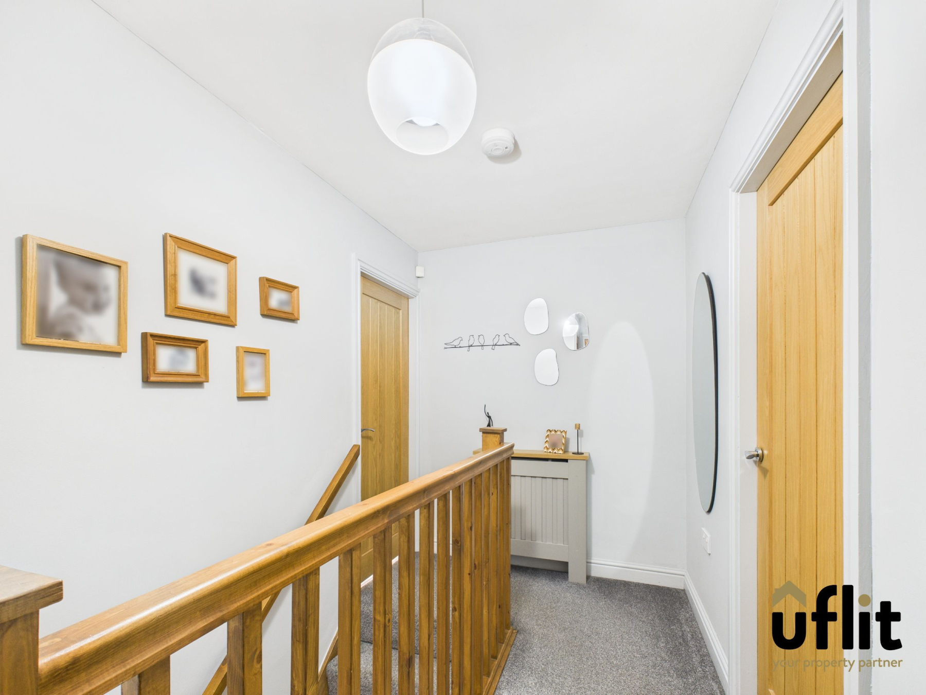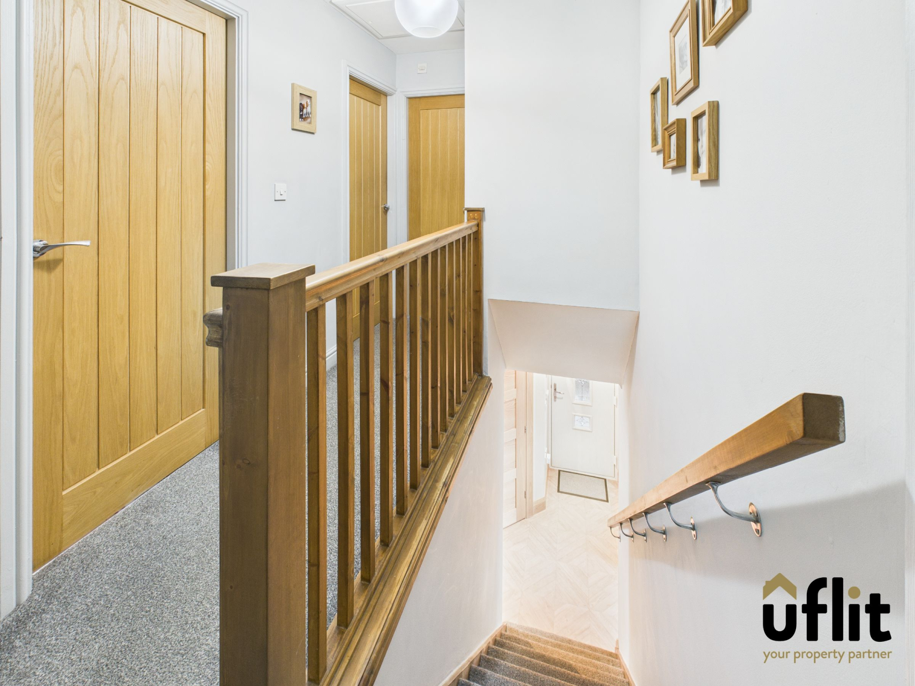 A carpeted landing with wooden balustrade, radiator and doors leading to all three bedrooms, the family bathroom and a storage cupboard.