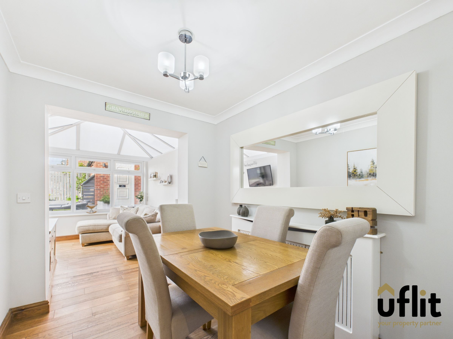 Solid wood flooring flows through this generous and versatile area, ideal for dining and entertaining. Featuring a conservatory-style roof, multiple windows, two radiators and French doors opening out onto the rear garden.