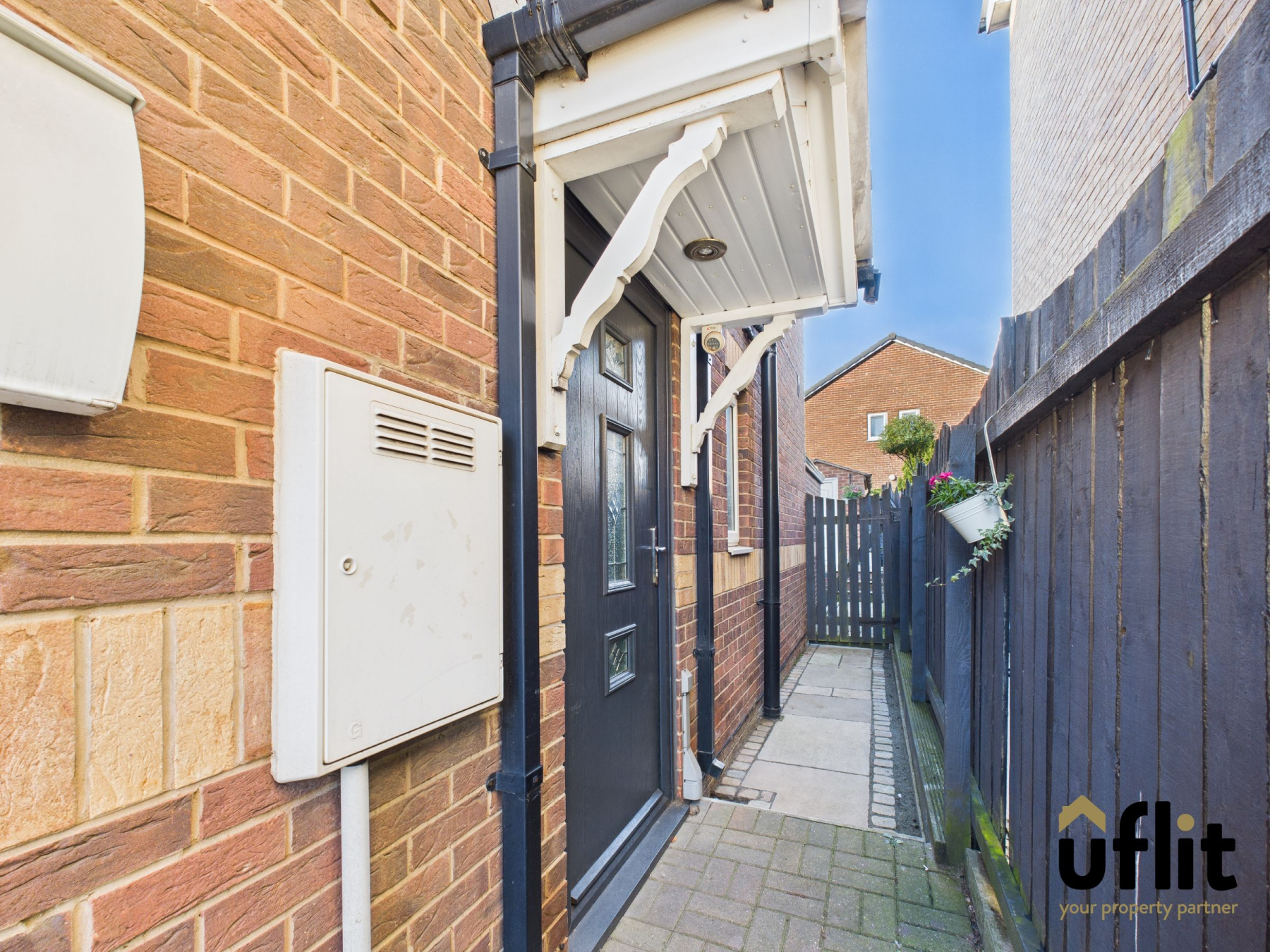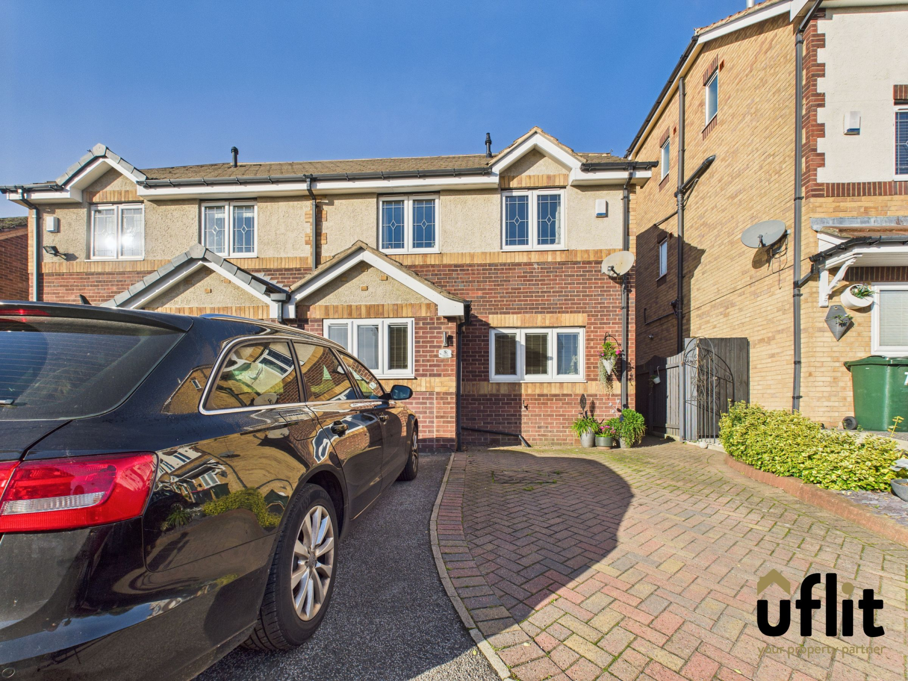 A part-paved, part-tarmac driveway offers off-road parking for two vehicles. Side gates provide access to both the front and rear of the property, leading to a stylish composite front door.