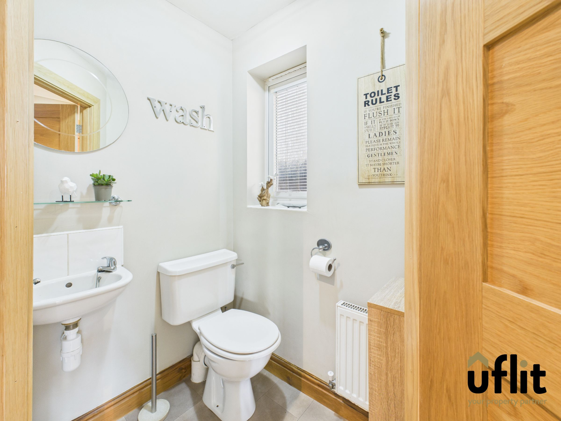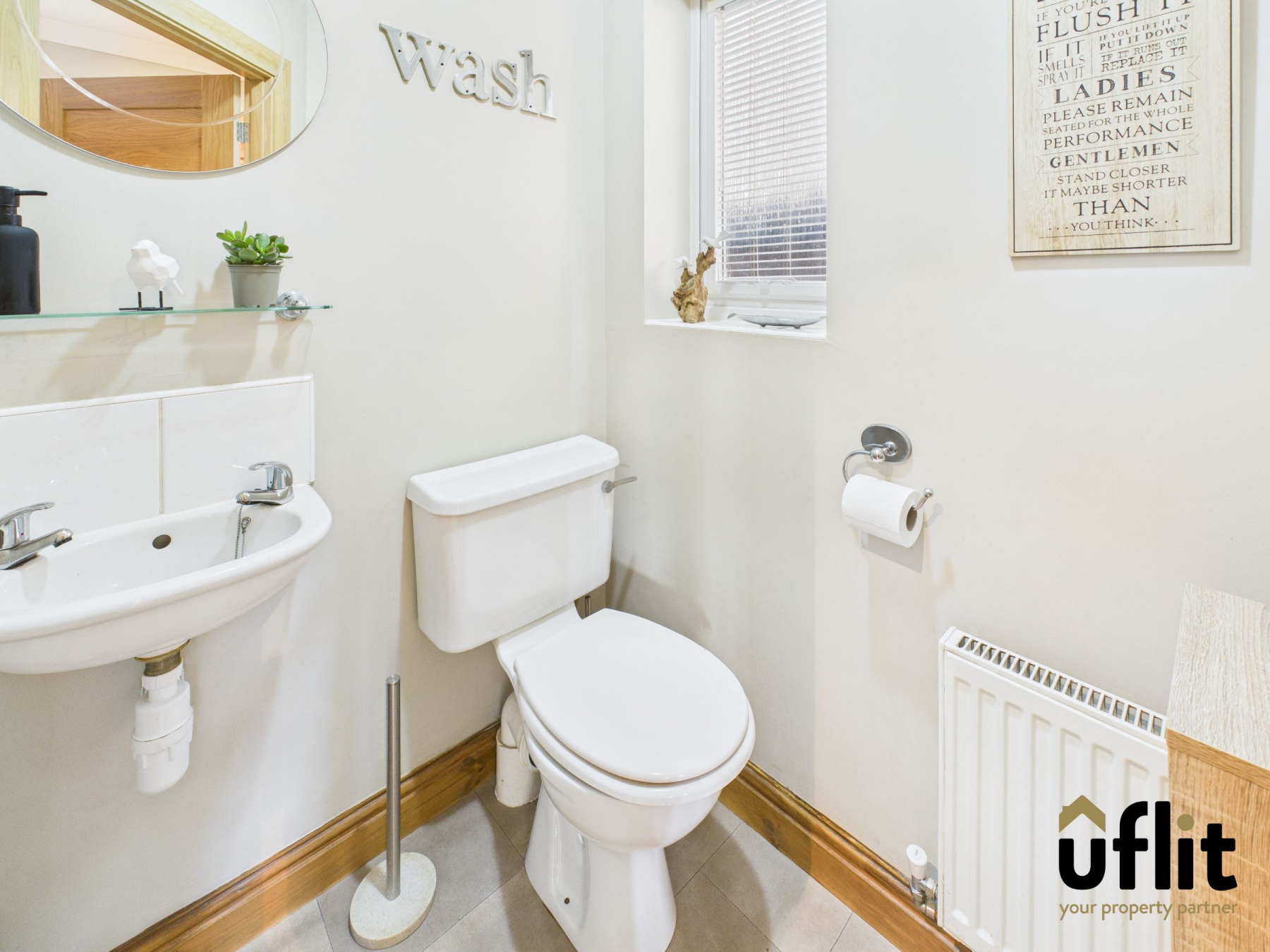 Comprising a low-level WC, wall-hung wash basin with tiled splashback, side window, radiator and tiled flooring.