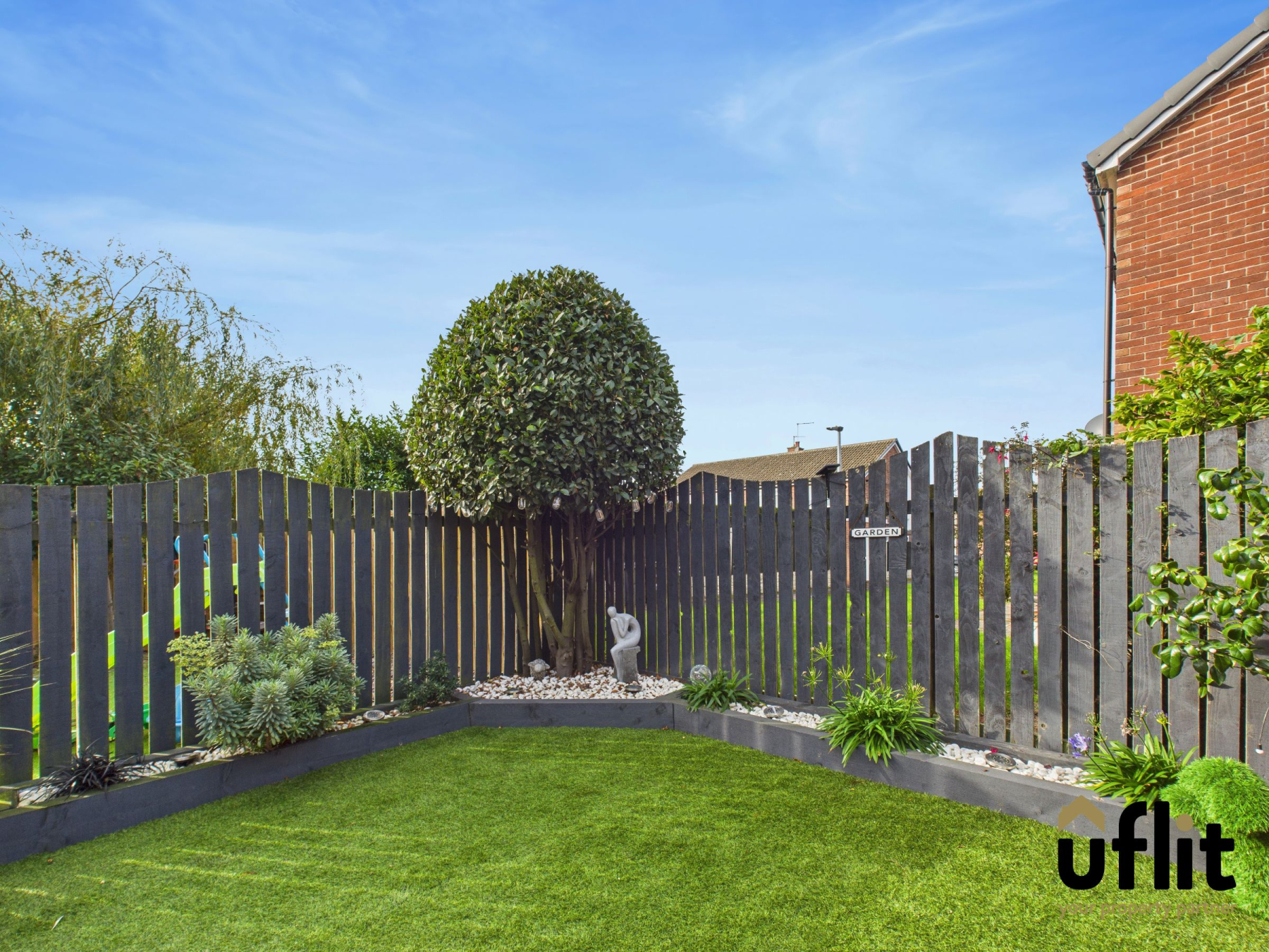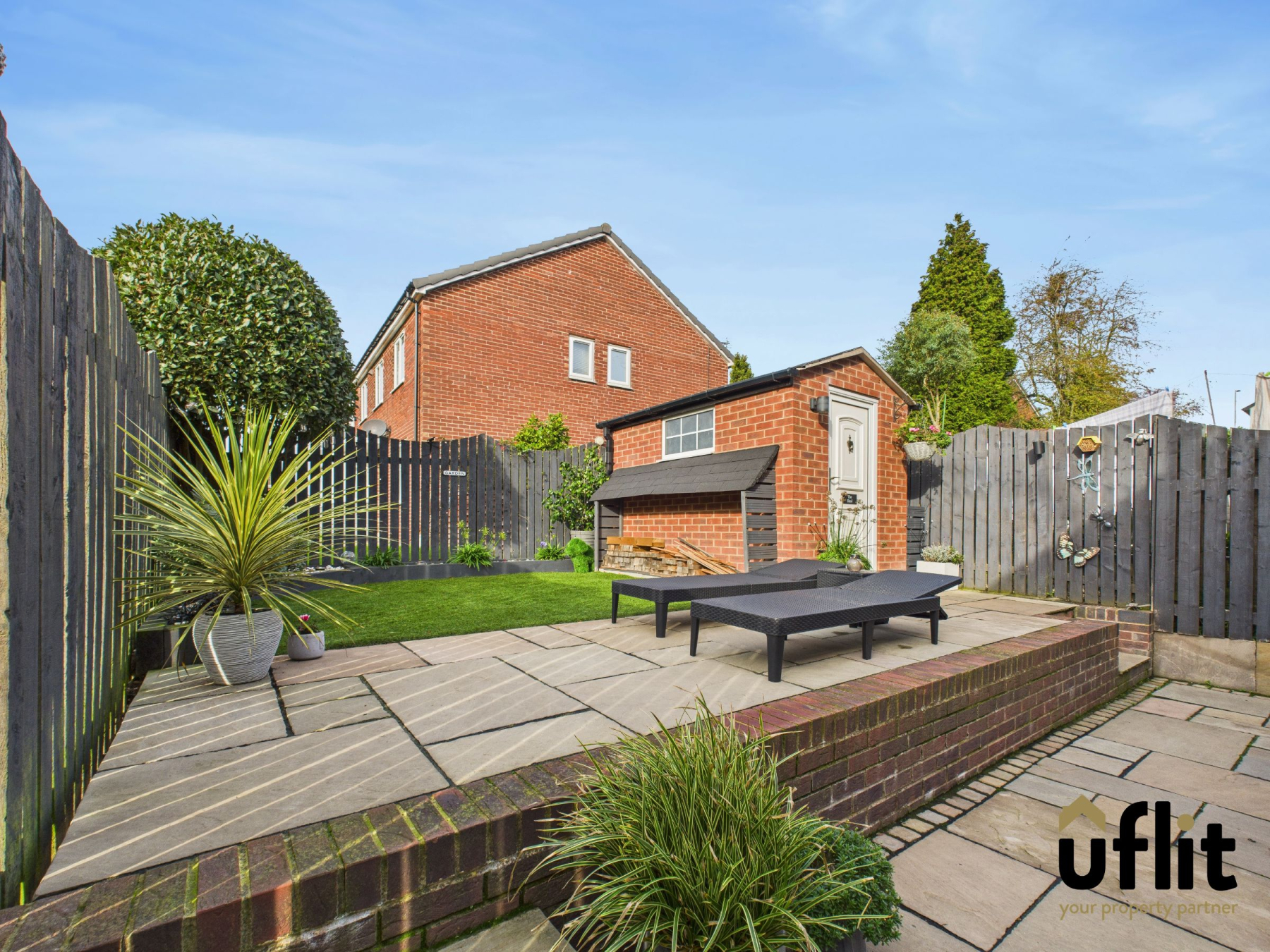 A well-maintained, fully enclosed tiered garden featuring a paved patio area with steps leading up to an Astro turf area perfect for outdoor relaxation or entertaining guests. Decorative borders are planted with shrubs and trees and a brick-built shed offers additional storage.