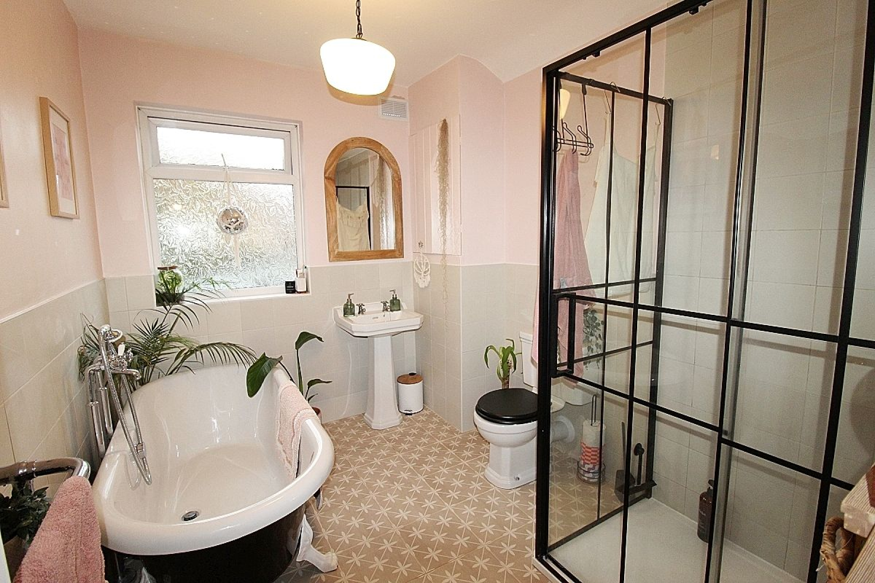 A stylish modern family bathroom benefitting from both bath and separate shower comprising of stunning free standing roll top bath with designer floor mounted taps and mixer tap shower, separate shower cubicle, wash hand basin and low level wc. Partially tiled walls with complementary bespoke tiled flooring, designer heated towel rail, built in storage and a rear facing upvc window.