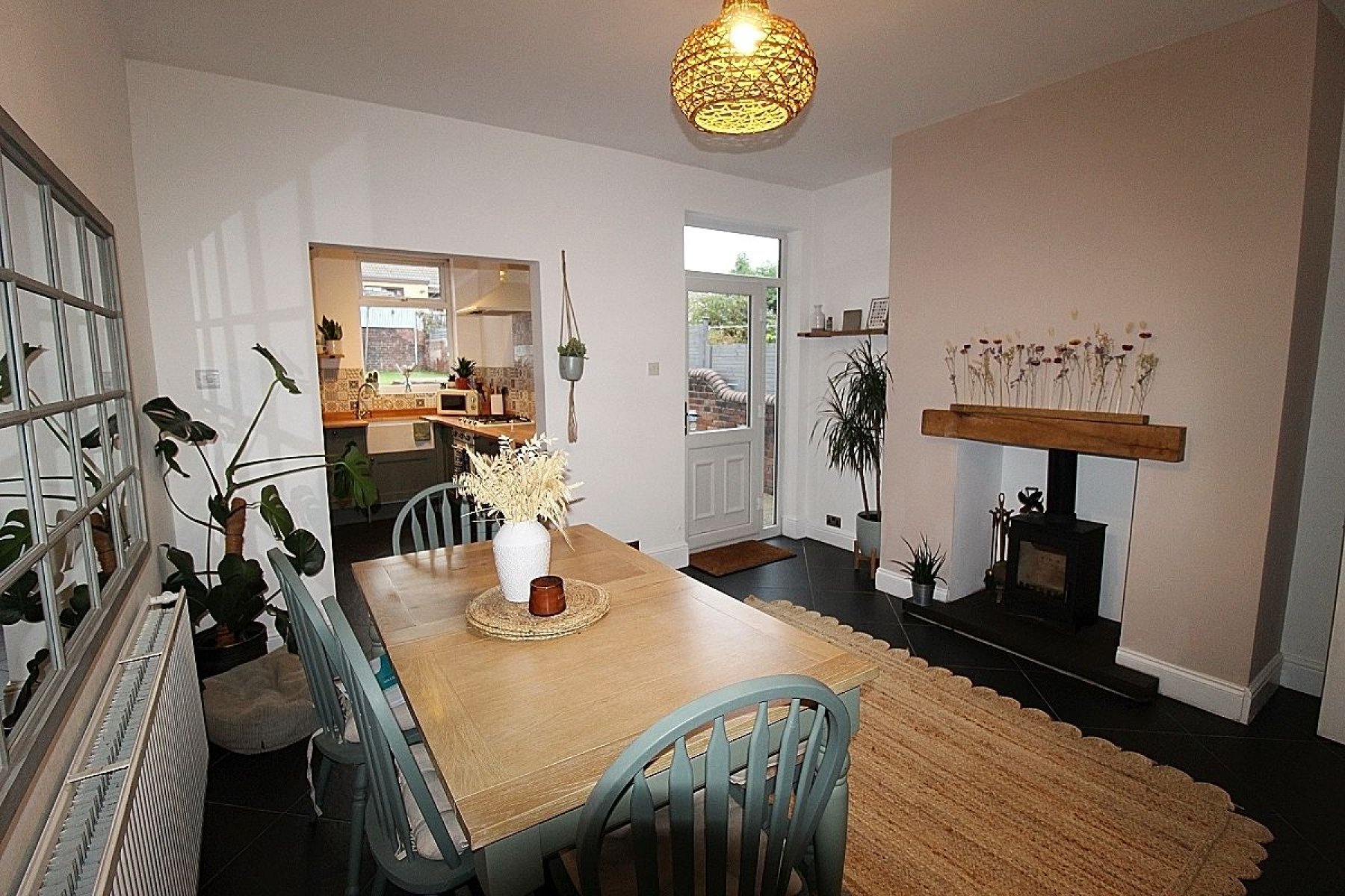 A modern diner with a bespoke recess to the chimney breast adopting the log burner sat on a tiled bed with solid oak mantel creating a feature, a rear facing upvc door with glazed side panel illuminates and a radiator adds warmth. A continuation of the tiled flooring seamlessly flows through to the offset open plan kitchen area and a door to the cellar.