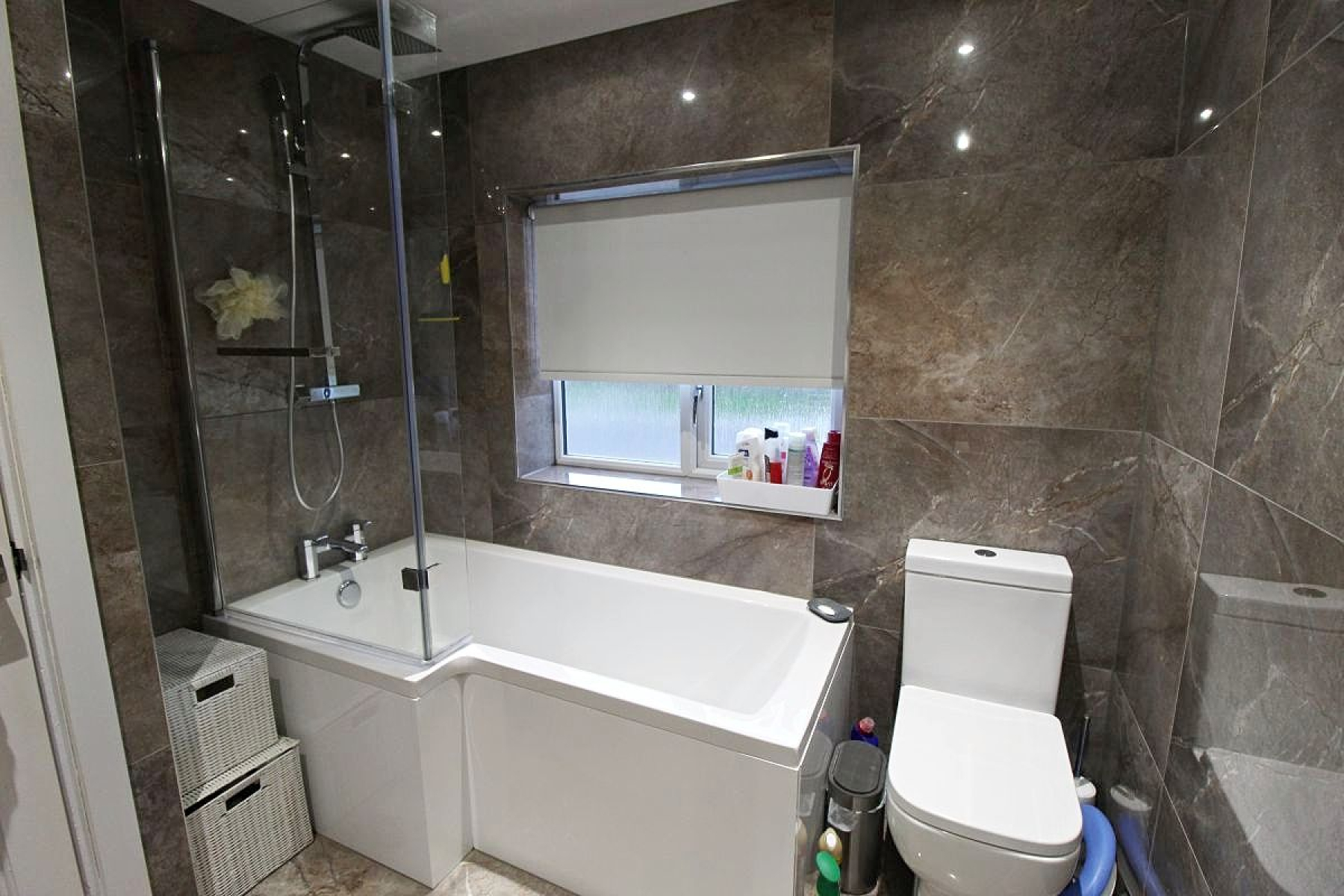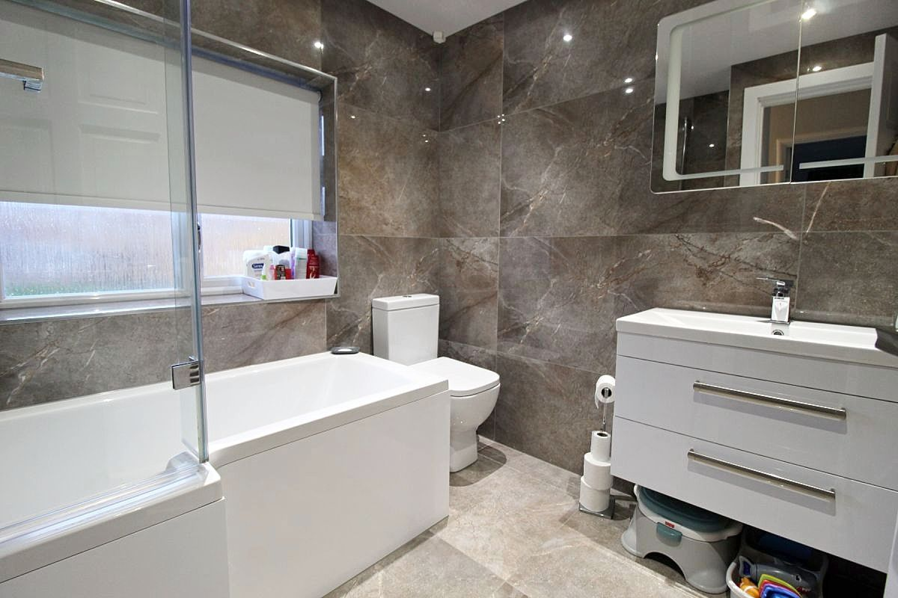 Family Bathroom w: 2.1m x l: 2.3m (w: 6' 11" x l: 7' 7") A stunning family bathroom comprising of a p shaped paneled bath with overhead shower and screen, a floating vanity wash hand basin and low level wc. Beautiful tiled walls with complimentary flooring, paneled ceiling with spot lighting, heated towel rail and a side facing upvc window.