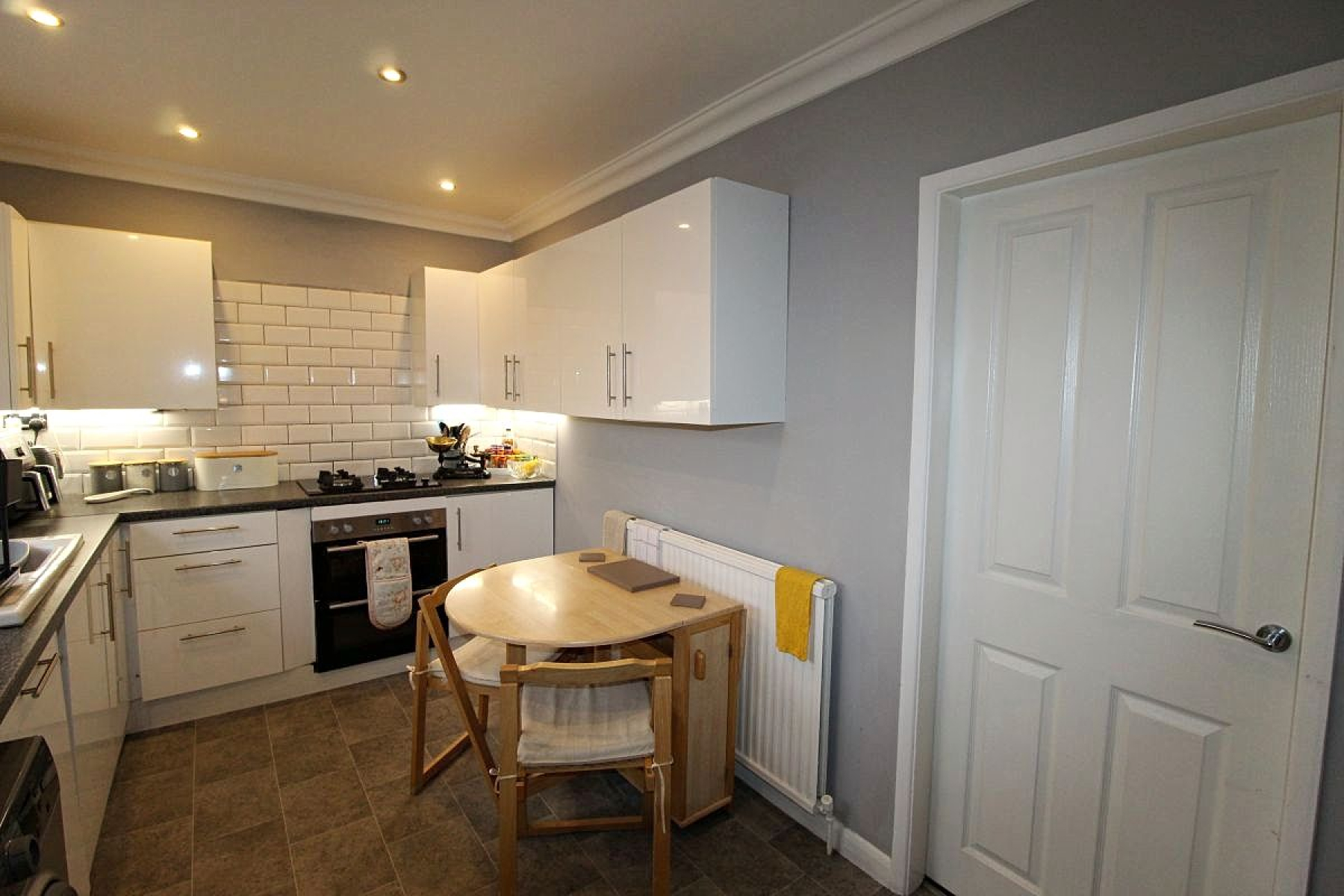 Kitchen/diner w: 5.2m x l: 2.5m (w: 17' 1" x l: 8' 2") A modern fitted kitchen comprising of a range of wall and base units with complimentary work surface areas, a counter top composite sink and tiled back panels. Appliances to include a built in double oven, gas hob, integrated dishwasher and plumbing for further utilities. Vinyl flooring seamlessly flows throughout, a radiator adds to the warmth, a rear facing upvc window illuminates whilst spot lighting sets the mood, a door to under stairs storage and a upvc door to the rear.