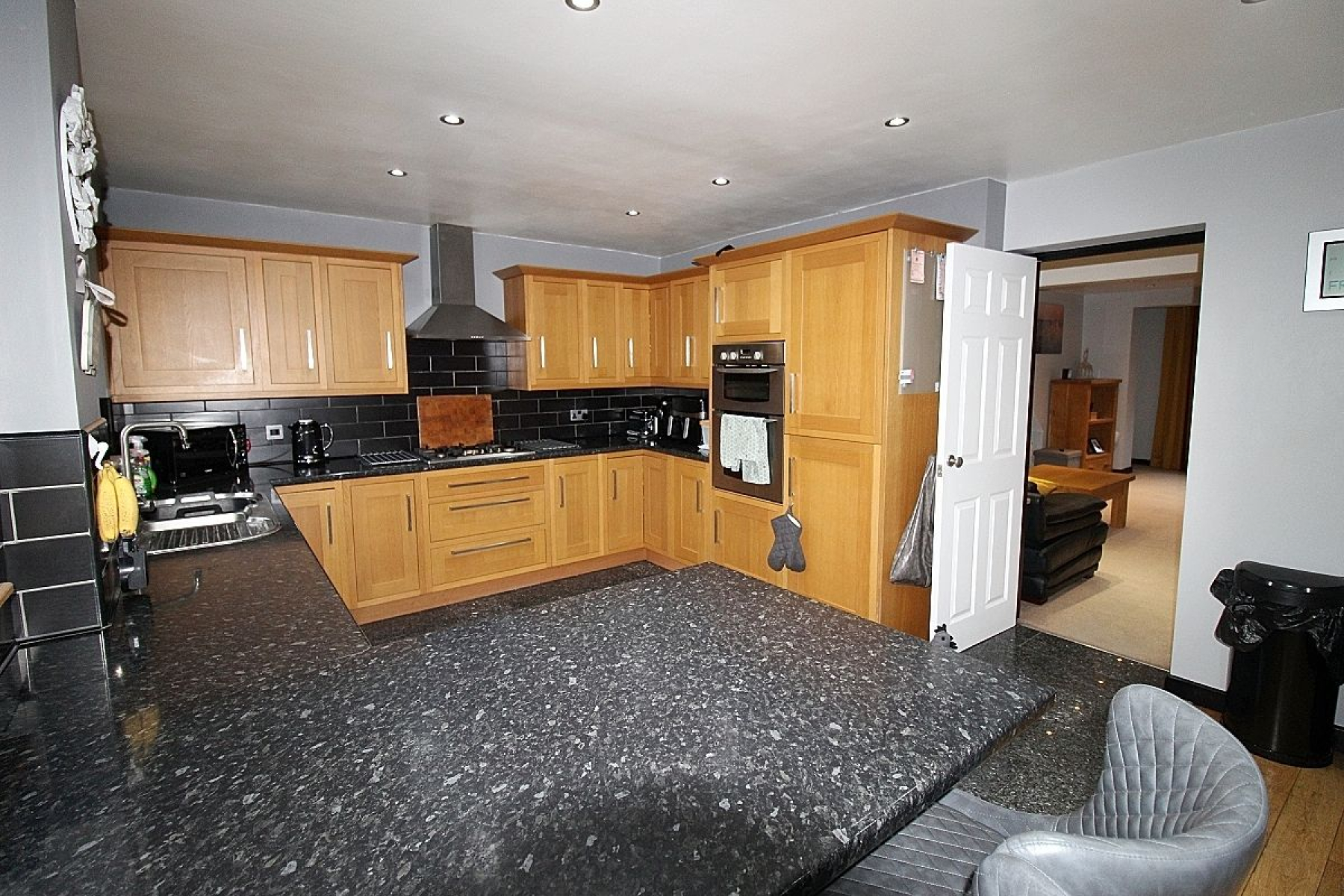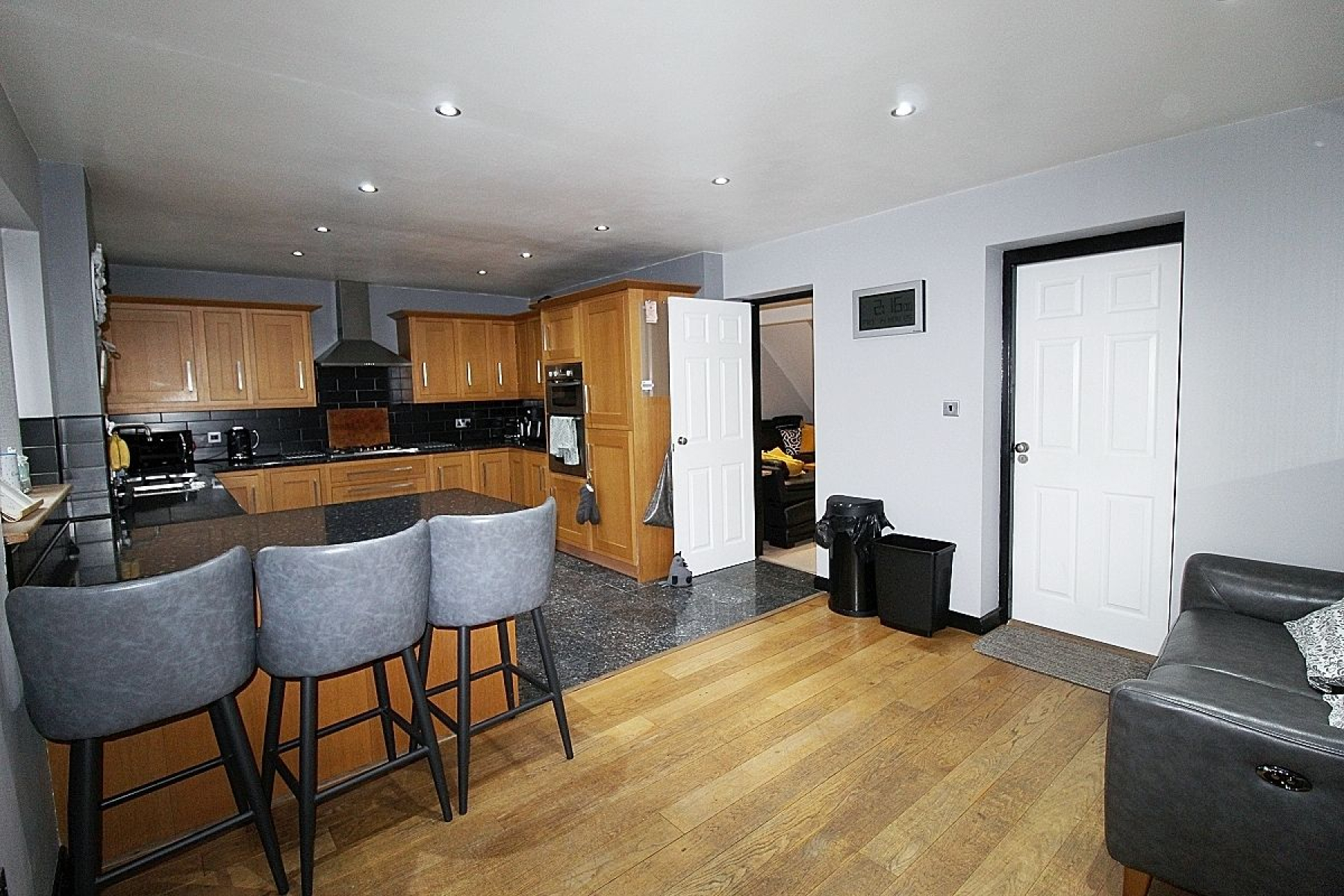 The heart of the home is this modern kitchen with a range of wall and base units, complemented by worksurface areas, an adjoining breakfast bar and tiled back panels. It comes equipped with a built in double oven, five burner gas hob, extractor fan integrated fridge freezer and dishwasher. Split tile to solid wood flooring gives a sense of separation to the dining area whilst retaining the open plan aspect. A radiator adds warmth, two rear facing upvc windows along with French doors open to the garden illuminate this entire space whilst spot lighting creates the mood and a further door to the utility area.