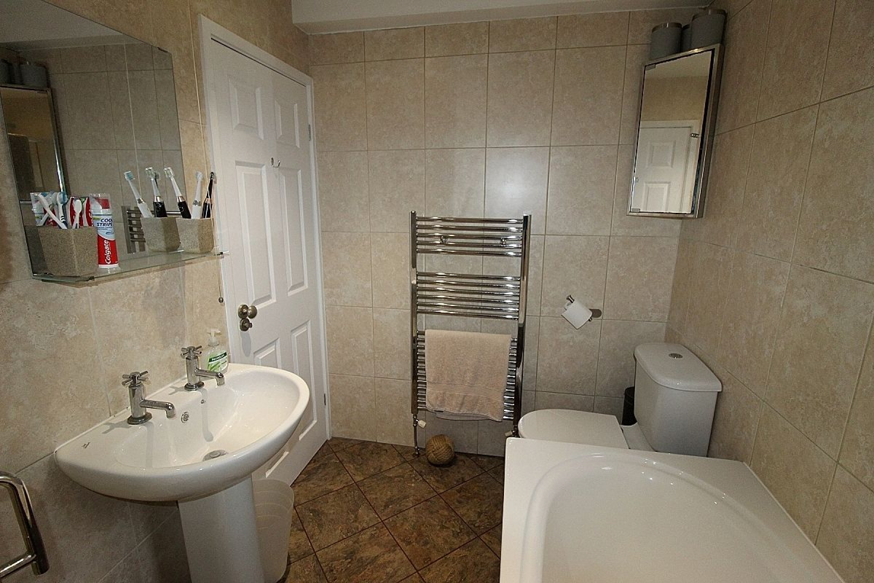 A modern and stylish family bathroom featuring both a bath and a separate shower. The suite includes a panelled bath, separate shower cubicle, wash hand basin and low-level WC. The room is fully tiled with contrasting floor tiles, while a rear-facing UPVC window, spot lighting and a heated towel radiator provide brightness and added comfort.