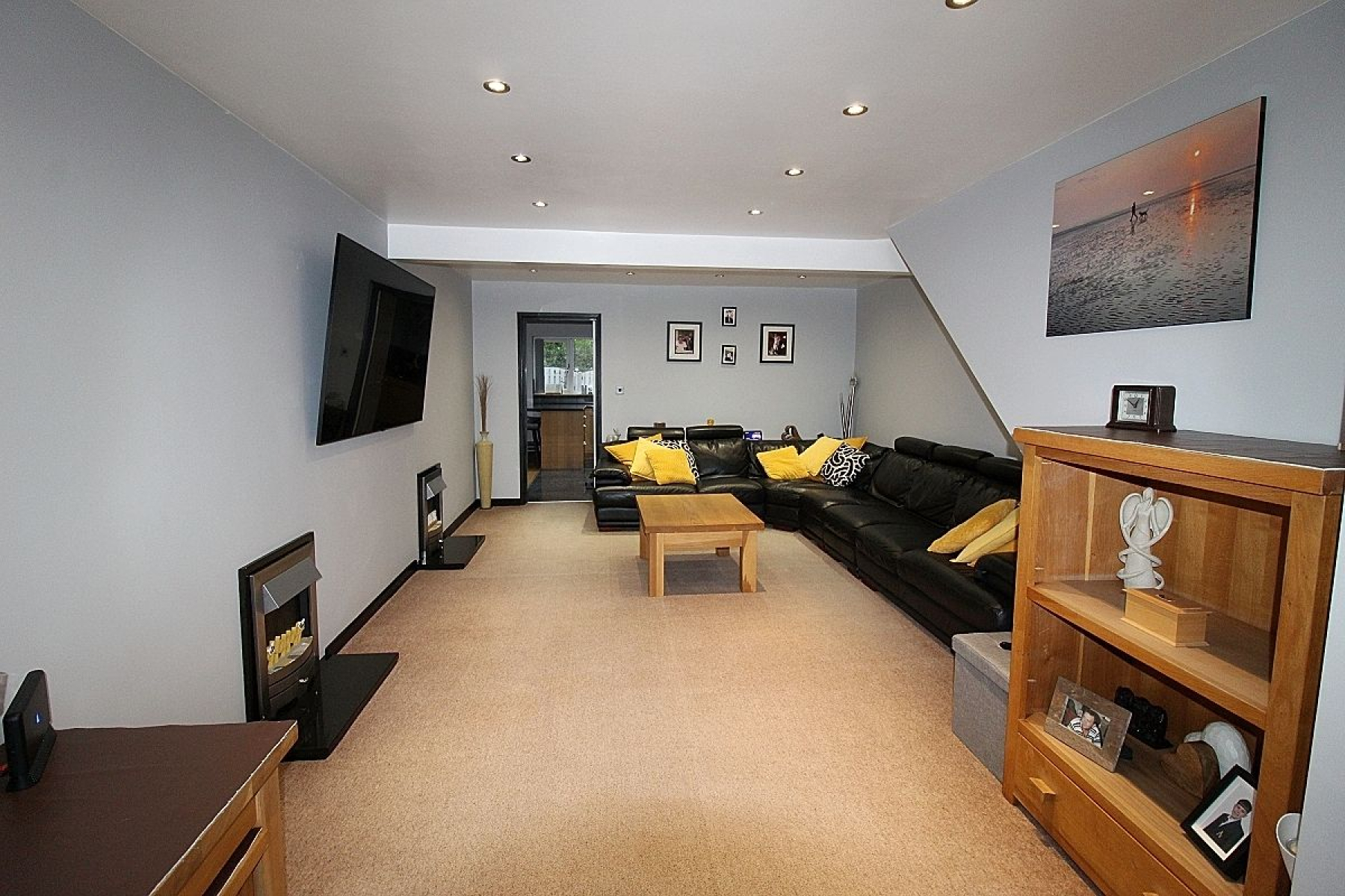 The spacious lounge boasts two feature fireplaces, a large window allowing an abundance of light, carpeted flooring, two radiators and a door leading to the breakfast kitchen/ diner