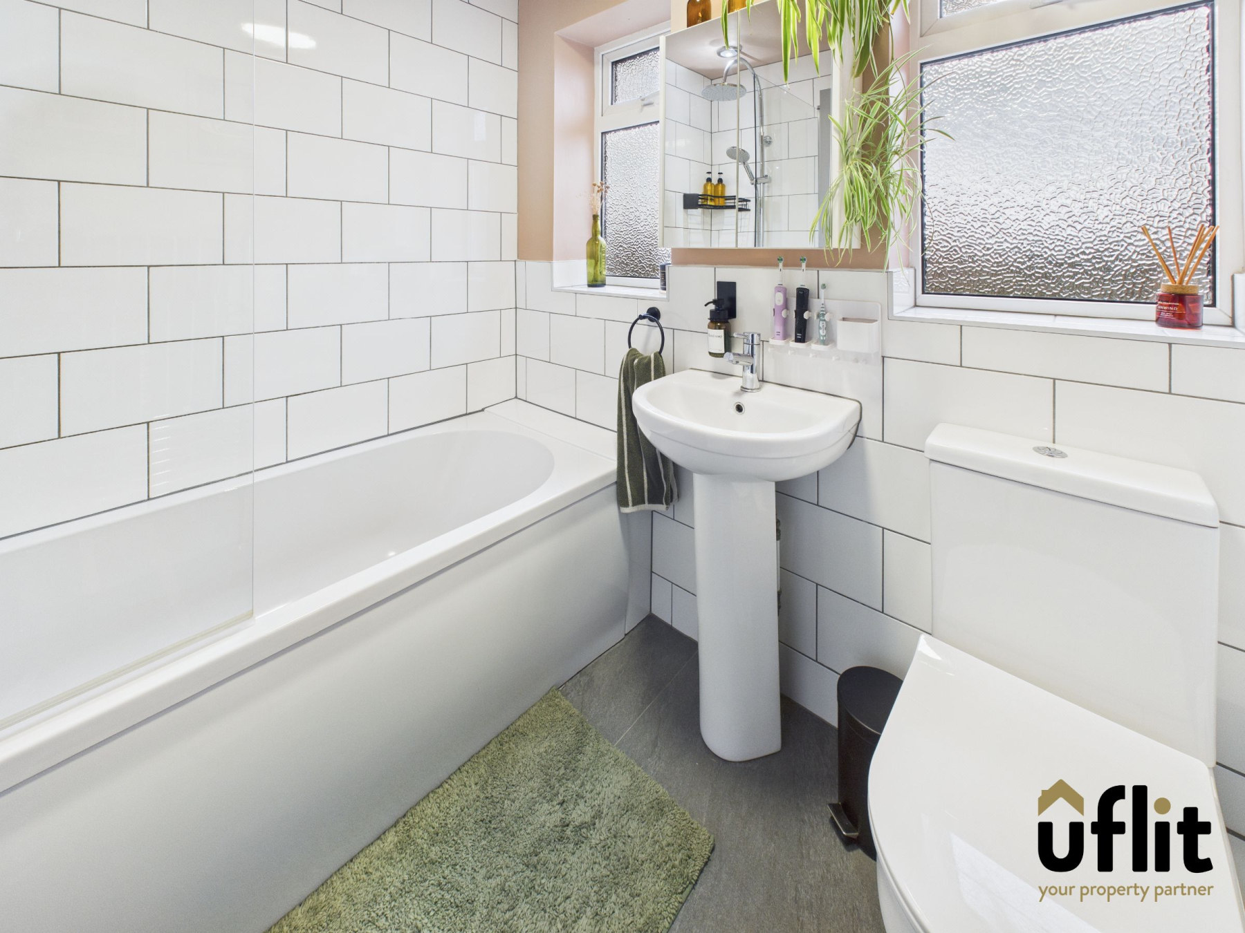 A modern family bathroom with bath and rainfall shower above with glass screen, pedestal sink and WC. Fitted storage cupboard, partial tiled walls, laminate flooring, two rear-facing windows and a chrome towel radiator.