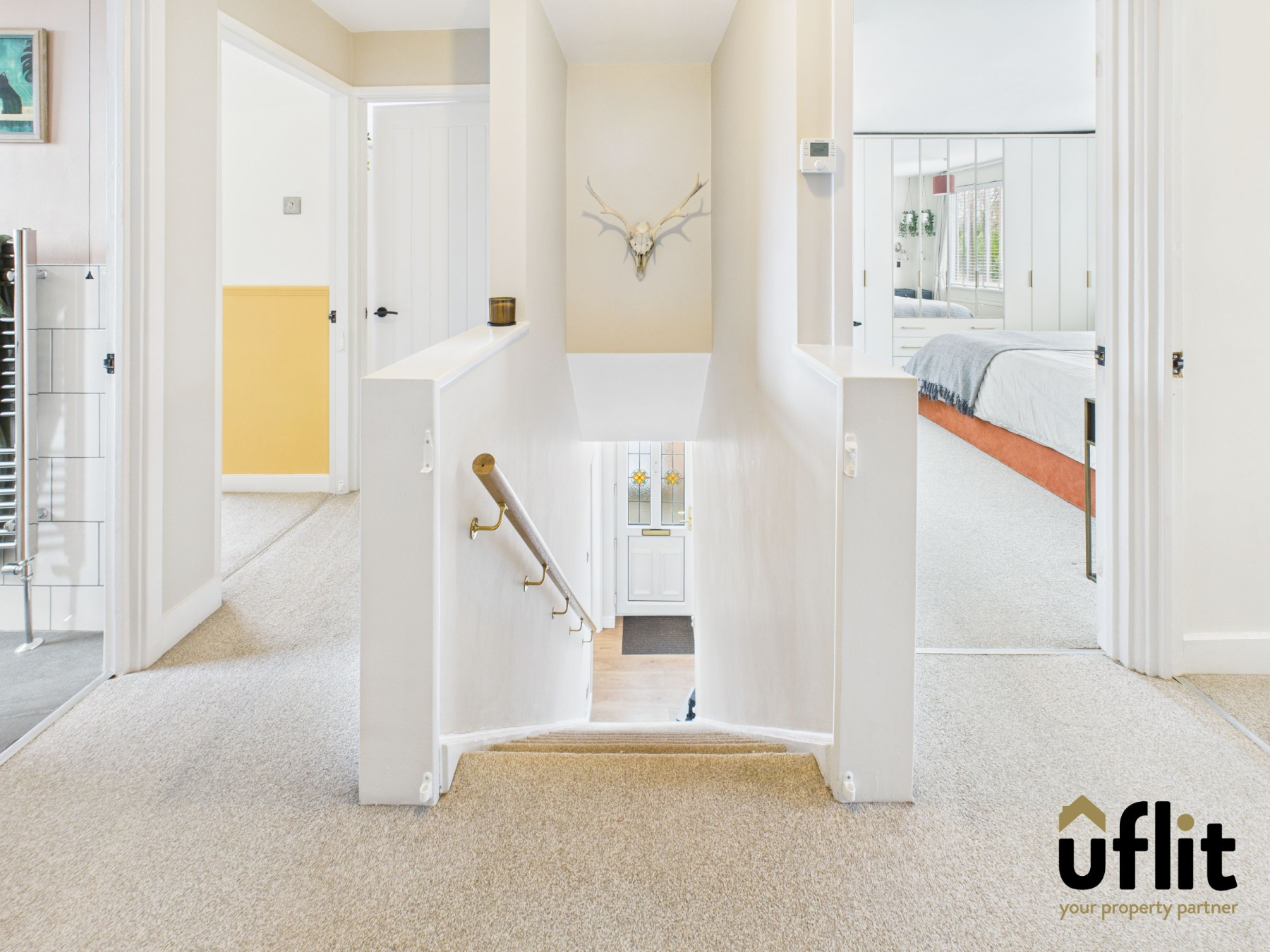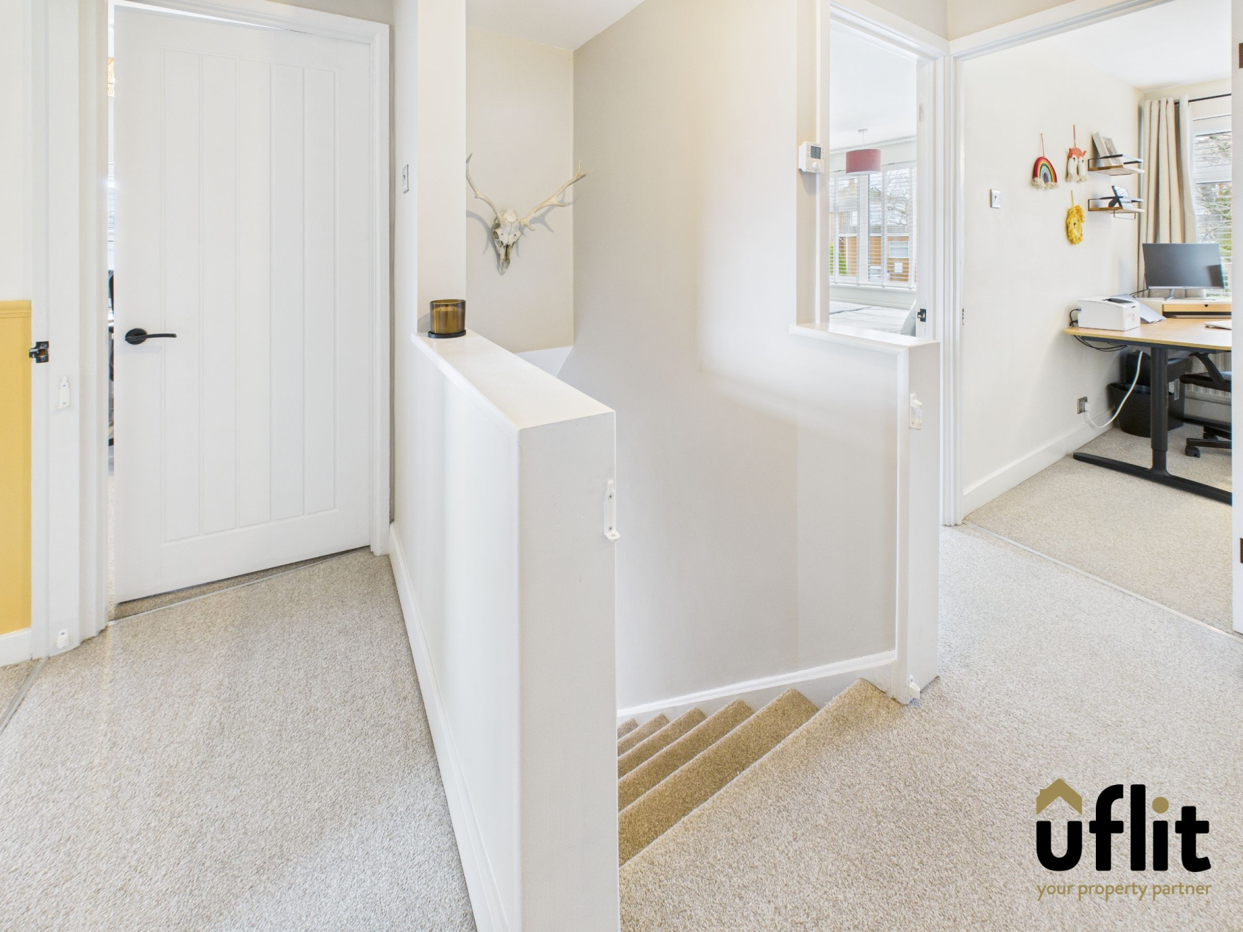 Carpeted landing with loft hatch providing access to a partially boarded loft. Doors to all four bedrooms and the family bathroom. Two fitted storage cupboards, one housing the combi boiler.