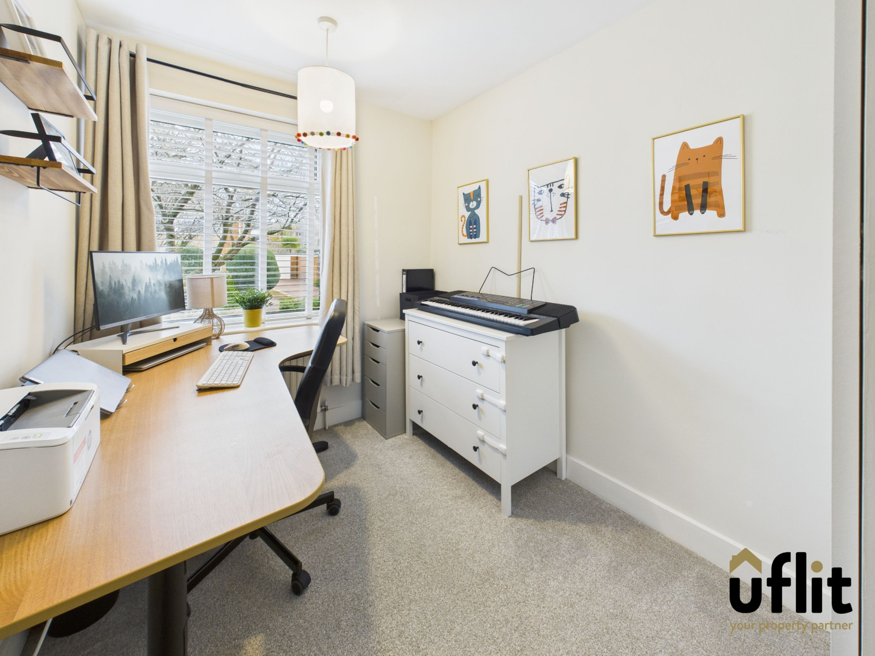 Another flexible room currently used as an office, featuring carpet, radiator and a side-facing window.
