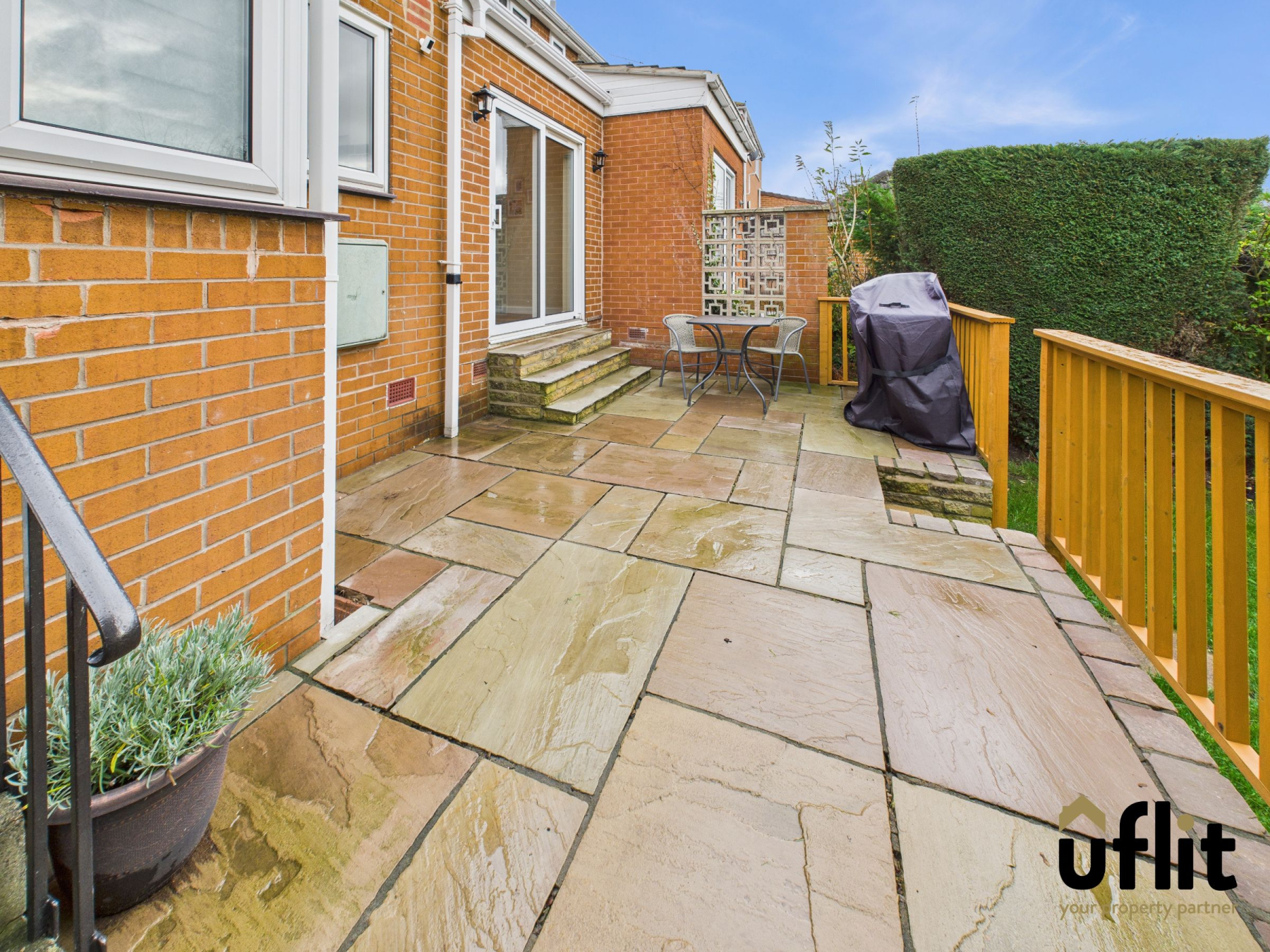 A driveway provides off-road parking for multiple vehicles, leading to the detached garage. A lawned area sits enclosed by hedges, with gated access to the rear garden. A beautifully enclosed rear garden with a mix of walls, hedges and fencing. Attractive Indian stone patio steps down to a lawn bordered with established trees and shrubs, offering an ideal outdoor retreat.