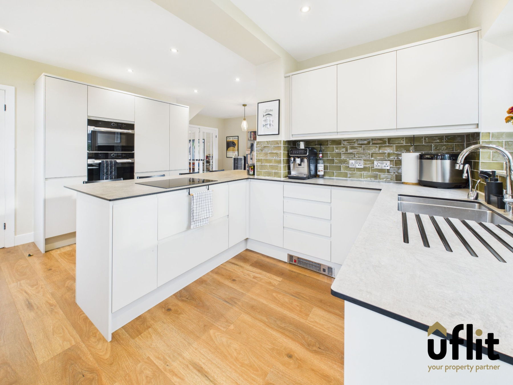 A modern and spacious open-plan kitchen/diner fitted with contemporary wall and base units, compact laminate worktops and tiled splashbacks. Integrated appliances include induction hob to the breakfast bar, double combi oven, dishwasher and fridge/freezer. Plinth heater, laminate flooring, radiator and spotlights to the ceiling. Ample dining space and double doors leading out to the rear garden. Under-stairs storage cupboard, with both side and rear-facing windows filling the room with light. Door to utility.