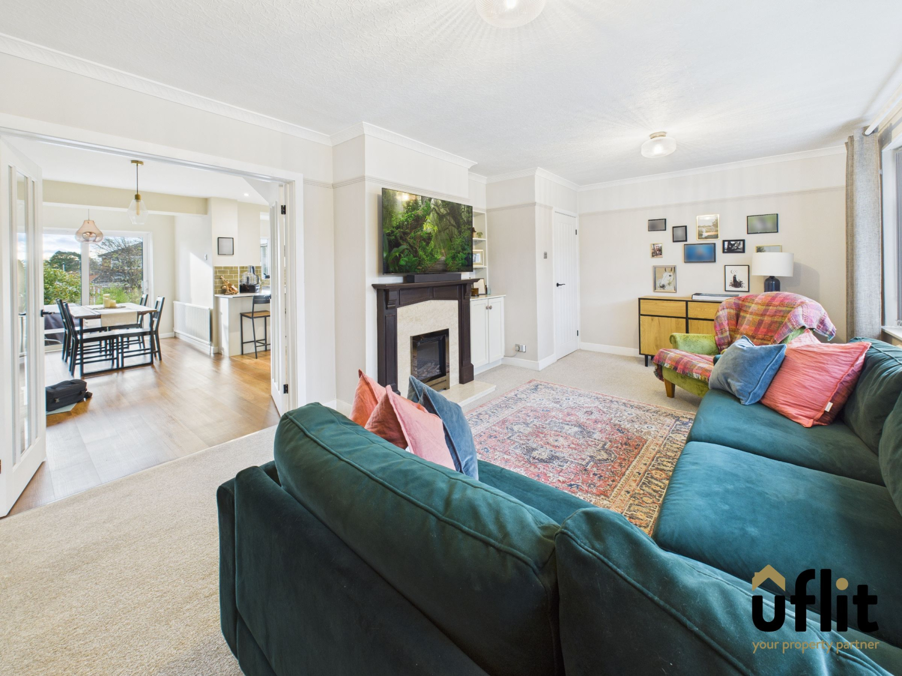 A cosy and inviting lounge featuring carpeted flooring, radiator and a front-facing window. A charming electric fire with surround and hearth acts as the focal point. The room is complemented by a picture rail adding character. Built-in storage with shelving above and double doors seamlessly open into the kitchen/diner.