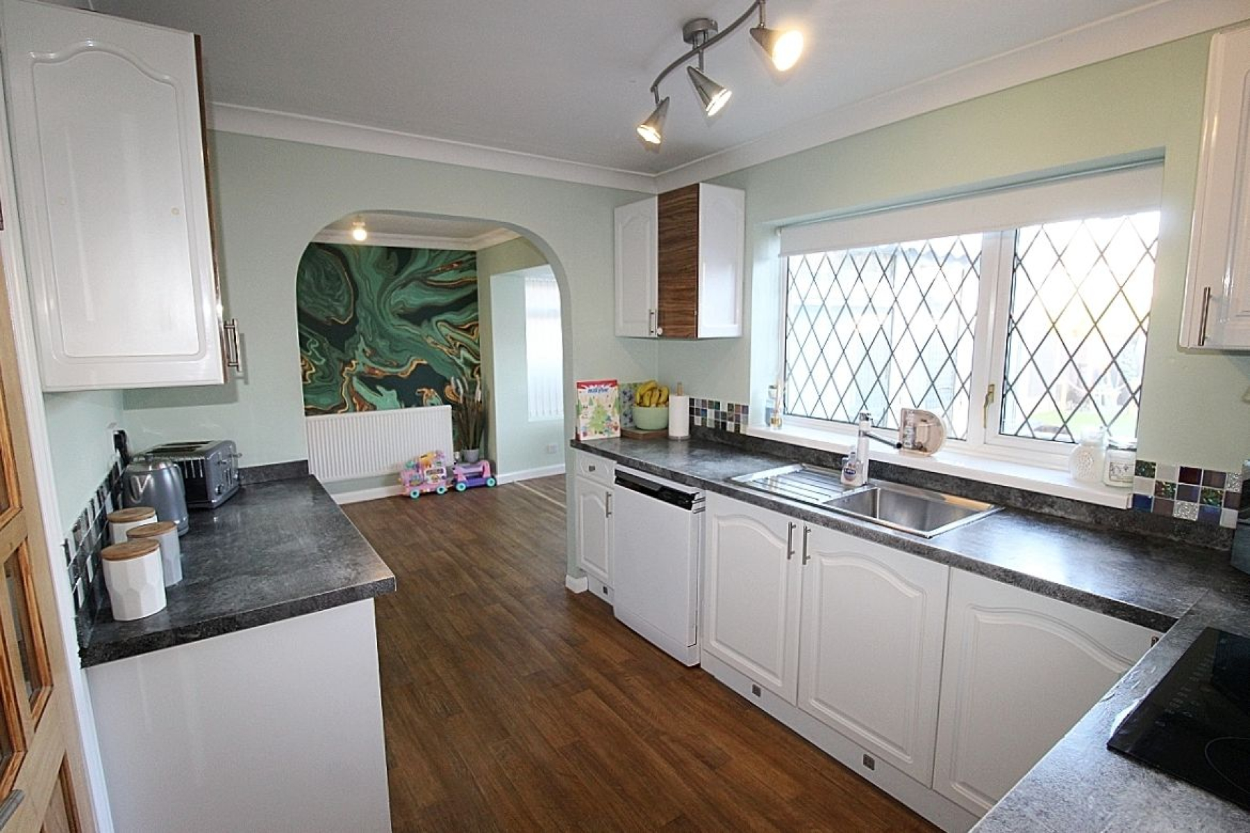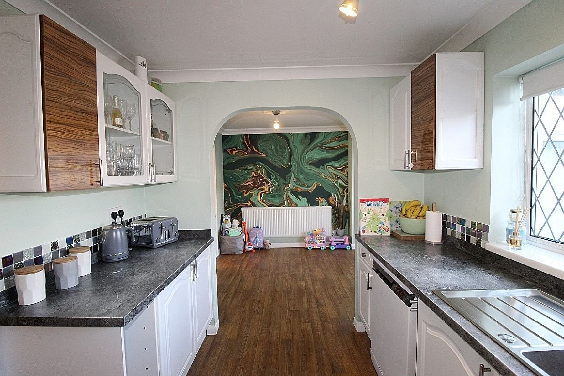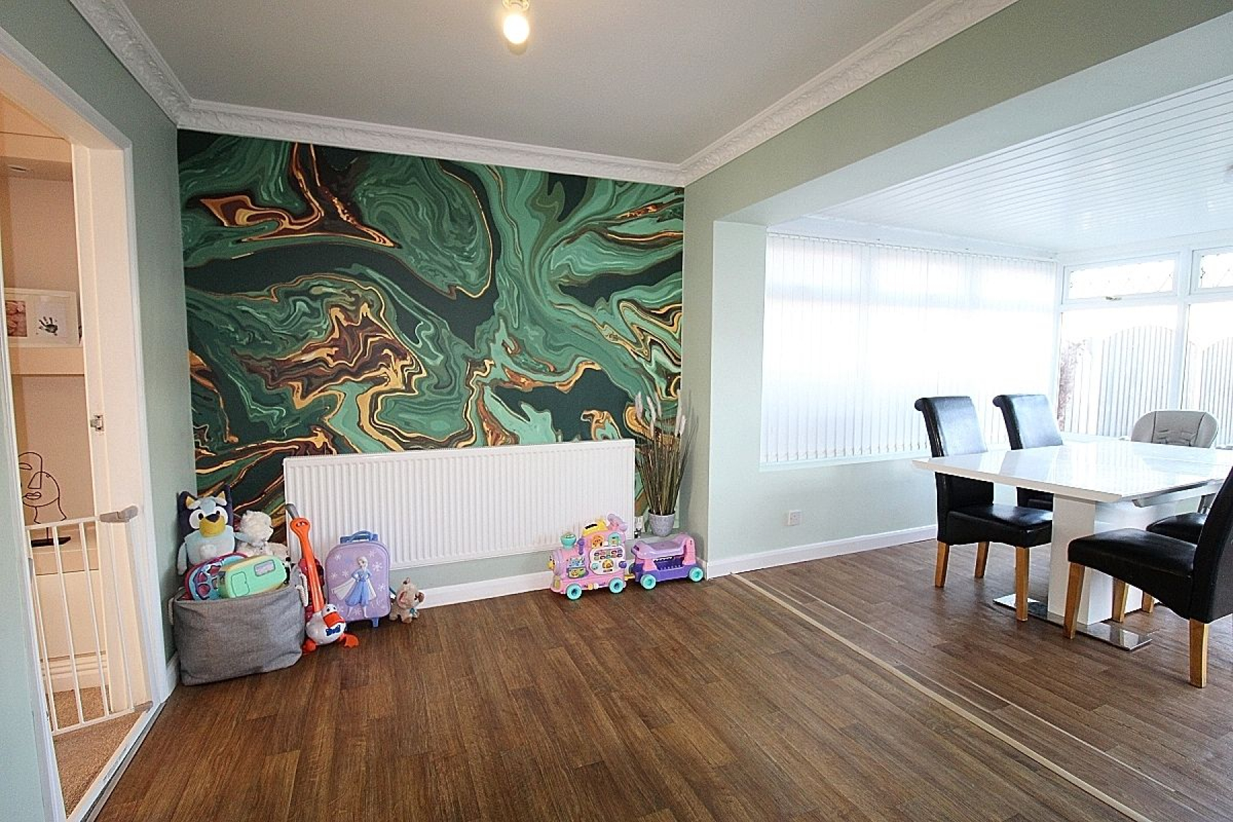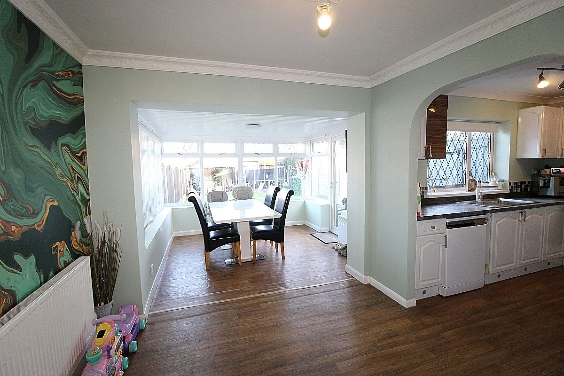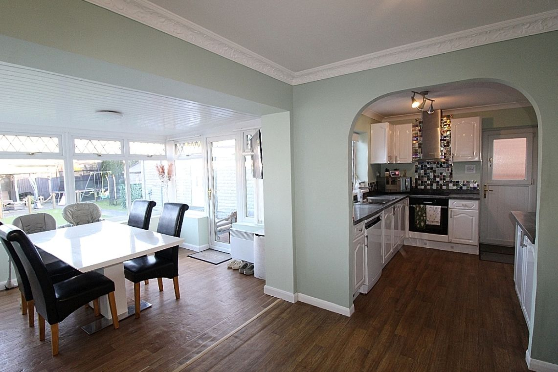 Featuring a range of wall and base units with complimentary work surface areas and modern tiled back panels, appliances to include a built in oven, hob and extractor fan with plumbing for further utilities. Further complimenting this modern kitchen is a counter top sink, laminate flooring splits to the offset conservatory giving a sense of separation to the open plan aspect. A rear facing upvc window, a glazed upvc barn door opens to the garden and a door to under stairs storage. A delicate arch leads to the dining area where a feature wall catches the eye and a glazed paneled solid wood door to the lounge.