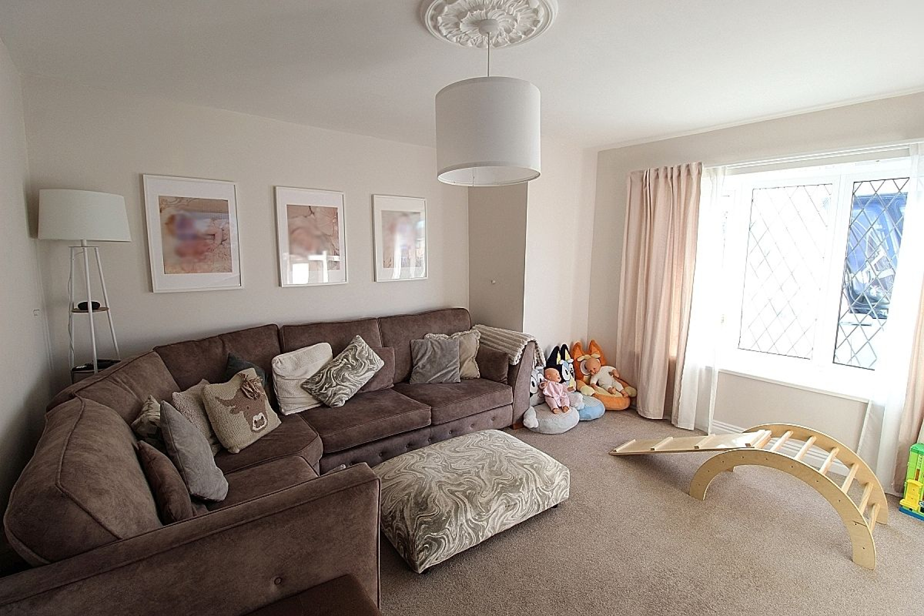 A spacious beautifully presented living area with a stunning focal feature bespoke media wall adopting the tv and fire, recess shelving and storage with an array of mood lighting, carpeted flooring seamlessly flowing throughout, designer radiator and a front facing upvc bay window illuminating.