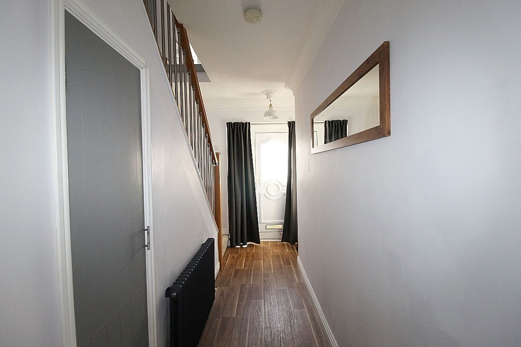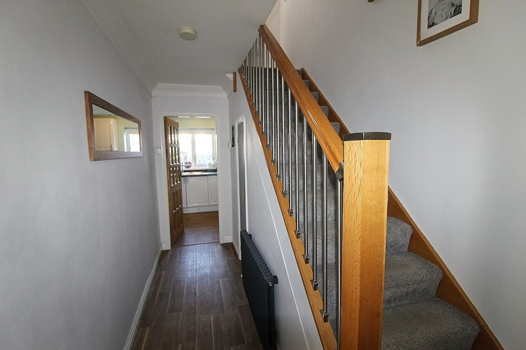A glazed upvc door with glazed side panel invites you in to this bright hallway with vinyl flooring, carpet stairs with bespoke banister leading to the first floor accommodation, designer radiator and a glazed paneled solid wood door giving access to the open plan kitchen.