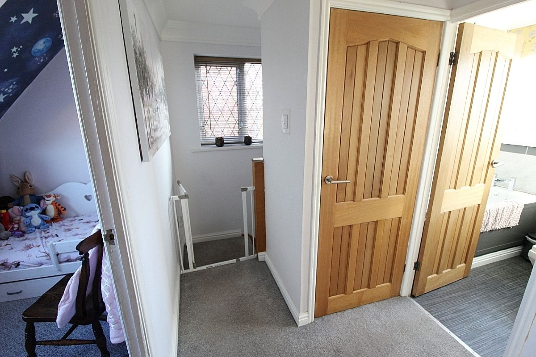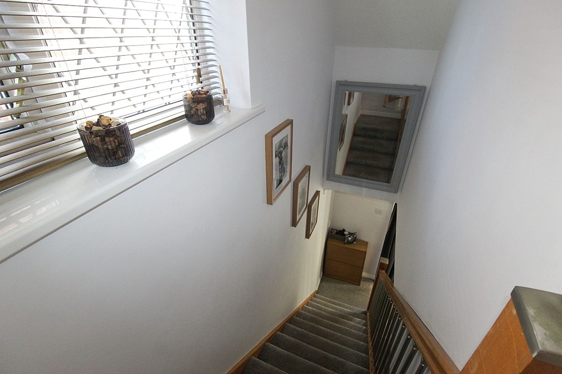 A carpeted landing with a side facing upvc window and doors giving access to three bedrooms, family bathroom, storage cupboard and a loft hatch for additional storage.