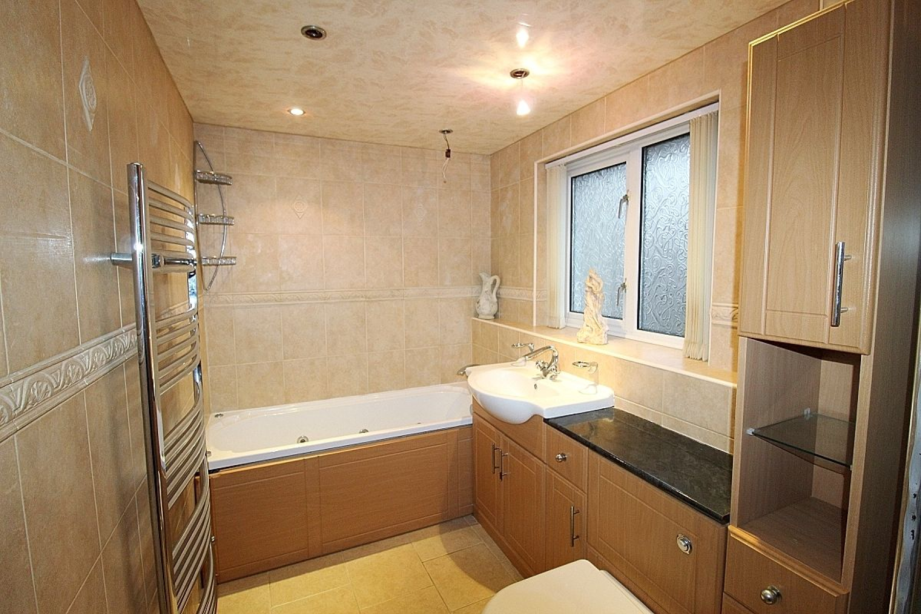 A modern family bathroom benefitting from both bath and separate shower comprising of a paneled bath, separate shower, a large vanity unit housing both wash hand basin and wc, fully tiled walls, tiled flooring, decorative paneled ceiling, heated towel rail and a upvc window.