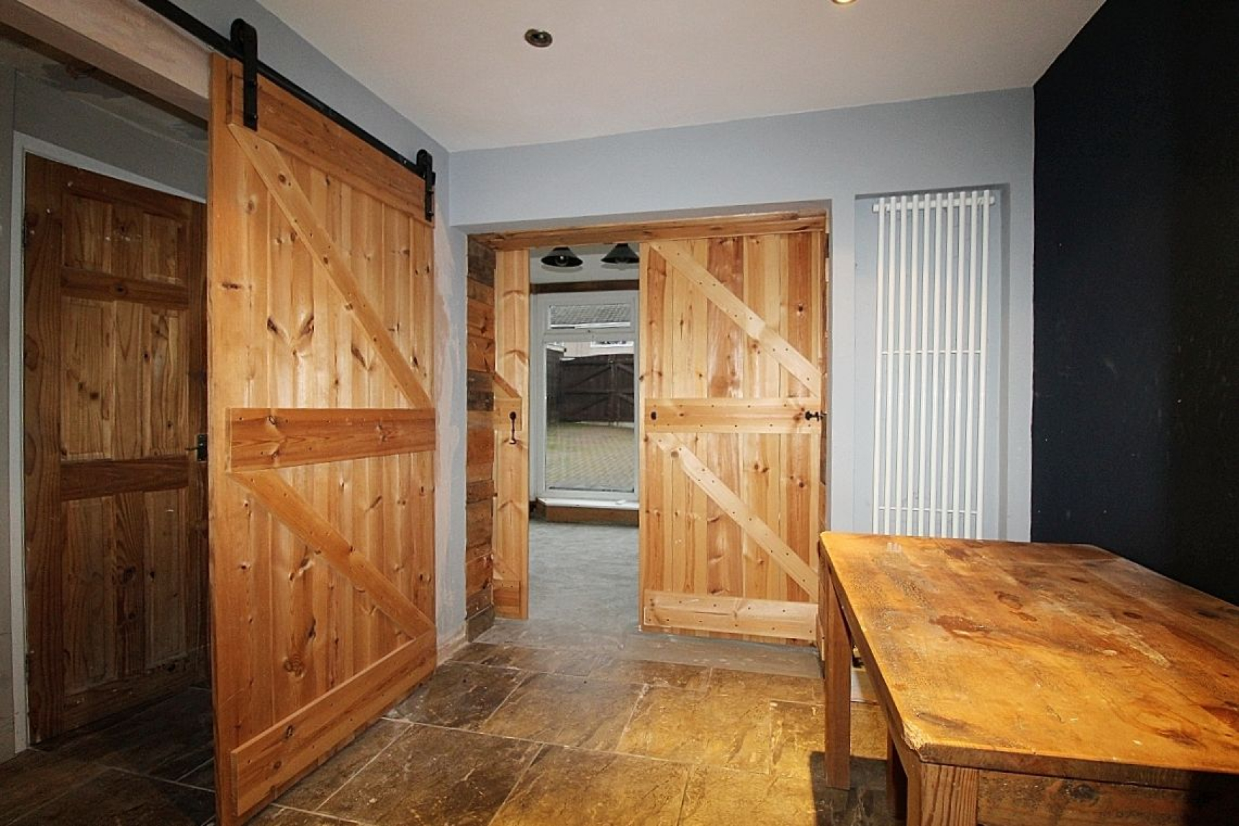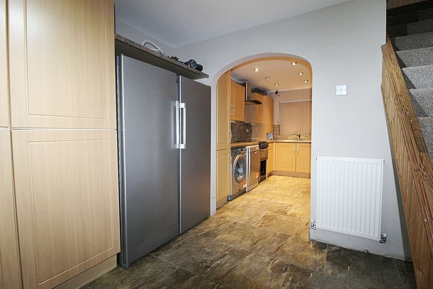 Entering through glazed French doors with glazed side panels to a spacious hallway, tiled flooring seamlessly flows through to the kitchen area, carpeted spindled stairs leading to the first floor accommodation, radiator , fitted storage cupboards, an opening gives access to the breakfast kitchen and a bespoke sliding door to the lounge.