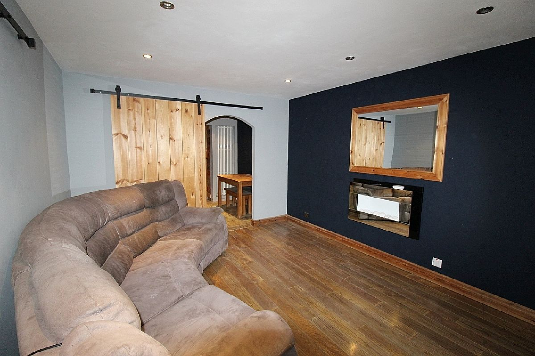 A spacious beautifully presented open plan lounge diner with a wall mounted feature fire, wooden flooring splits to tiles in the dining area, a front and facing upvc window allows an abundance whilst bespoke sliding doors give access to the conservatory and two radiators add warmth.