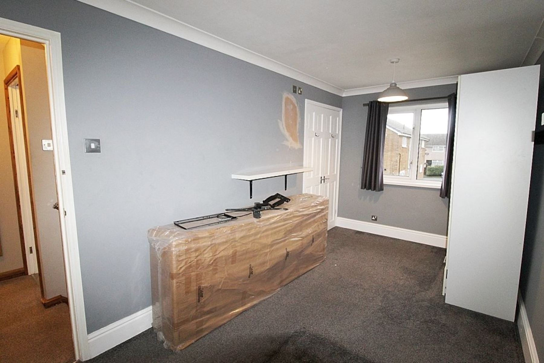 A double bedroom with a range of fitted wardrobes, carpeted flooring, radiator and a upvc window.