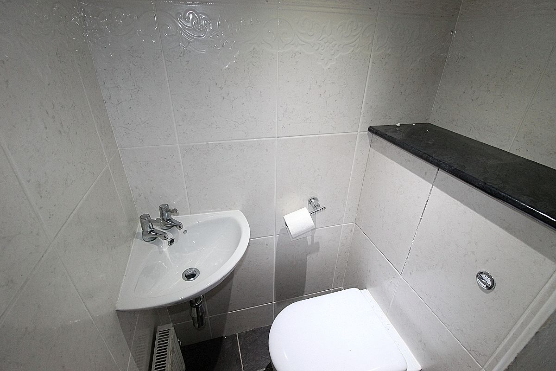 Comprising of a low level wc, floating wash hand basin, fully tiled with a decorative paneled ceiling, radiator and a rear facing upvc window.