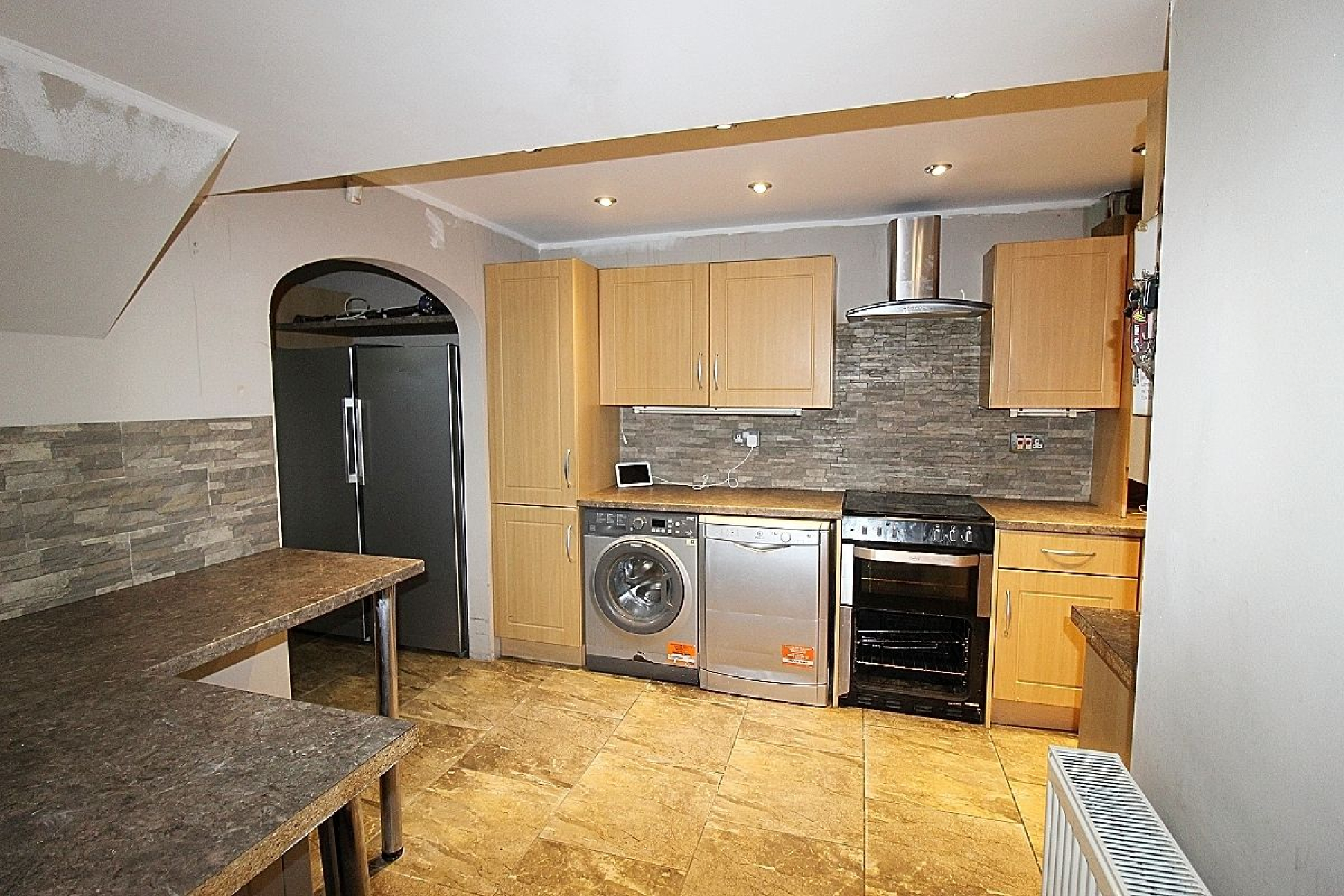 Featuring a range of wall and base units with complimentary work surface areas, a complimentary breakfast bar and tiled back panels. Appliances to include an inset oven, extractor fan and plumbing for further utilities. A rear facing upvc window along with spot lighting illuminates, radiator, spot lighting, a continuation of the tiled flooring seamlessly flowing through to the offset dining area entered via a bespoke sliding door and a further door to the wc.