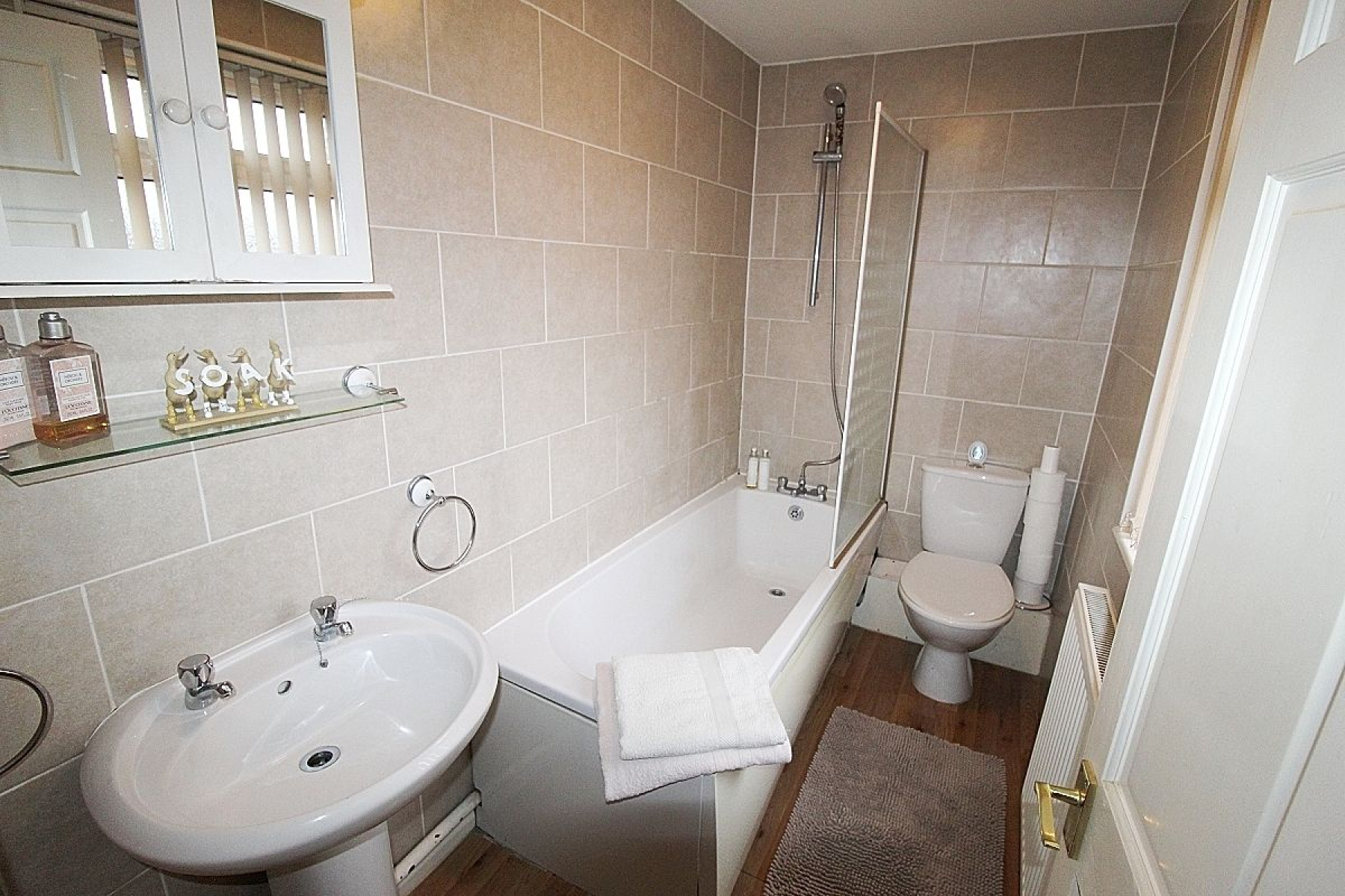Family Bathroom w: 2.7m x l: 1.4m (w: 8' 10" x l: 4' 7") Comprising of a panelled bath with overhead shower and screen, wash hand basin and a low level wc Fully tiled walls with contrasting flooring, radiator and a upvc window.