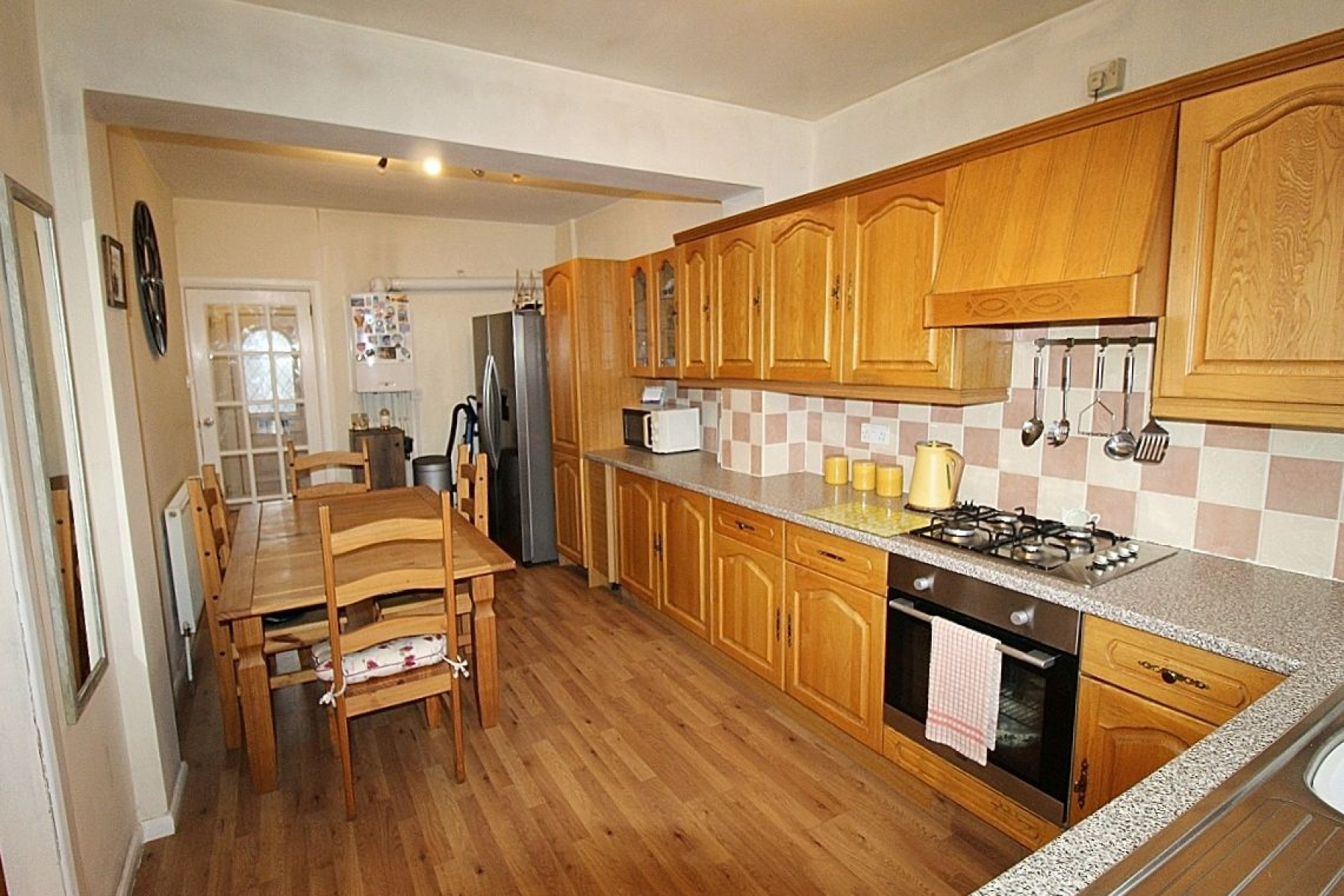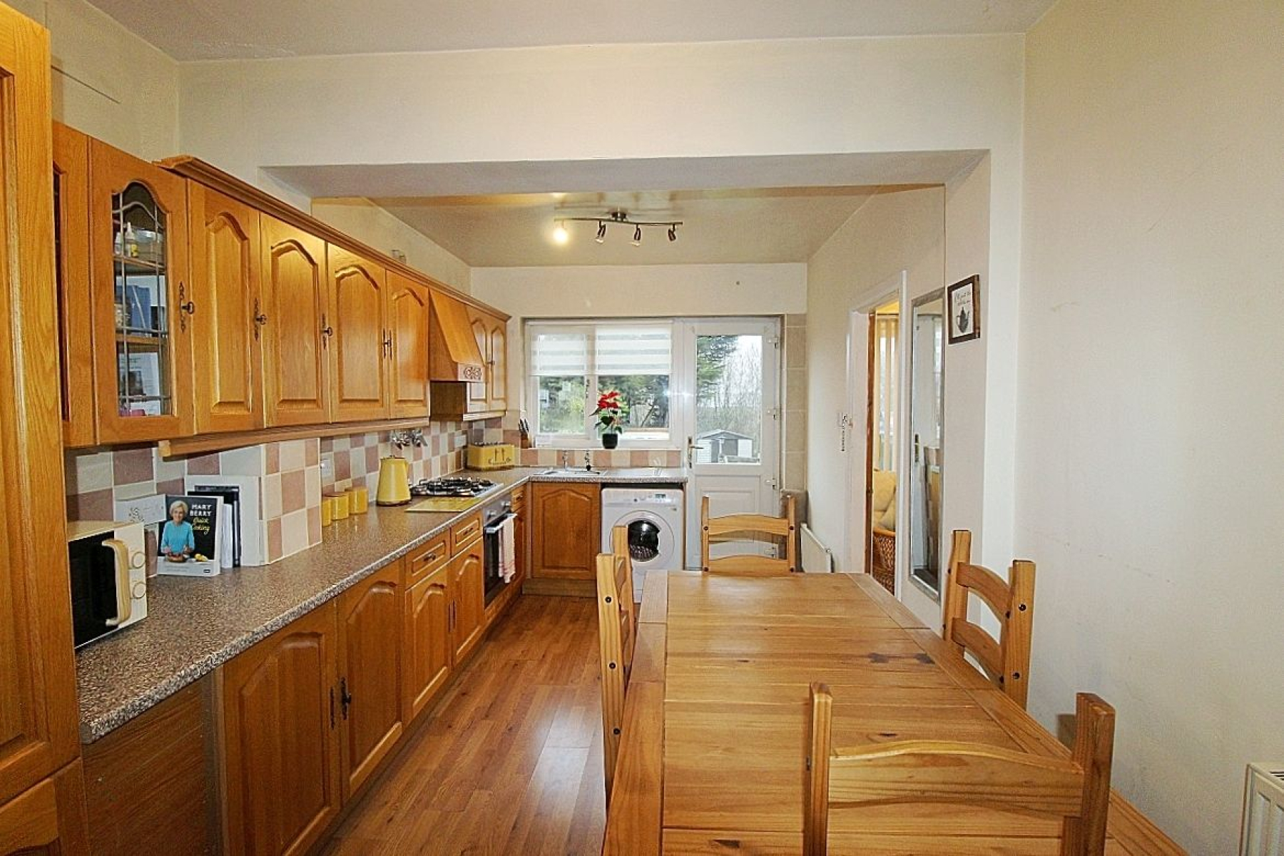 Breakfast kitchen w: 2.8m x l: 5.9m (w: 9' 2" x l: 19' 4") A solid wood kitchen featuring a large range of wall and base units with complimentary work surface areas and tiled back panels. Appliances to include a built in oven, gas hob, extractor fan and plumbing for a range of utilities. A rear facing upvc window allows light along with a glazed upvc door giving further access to the rear, a continuation of the laminate flooring, two radiators and a further glazed paneled door to the snug.