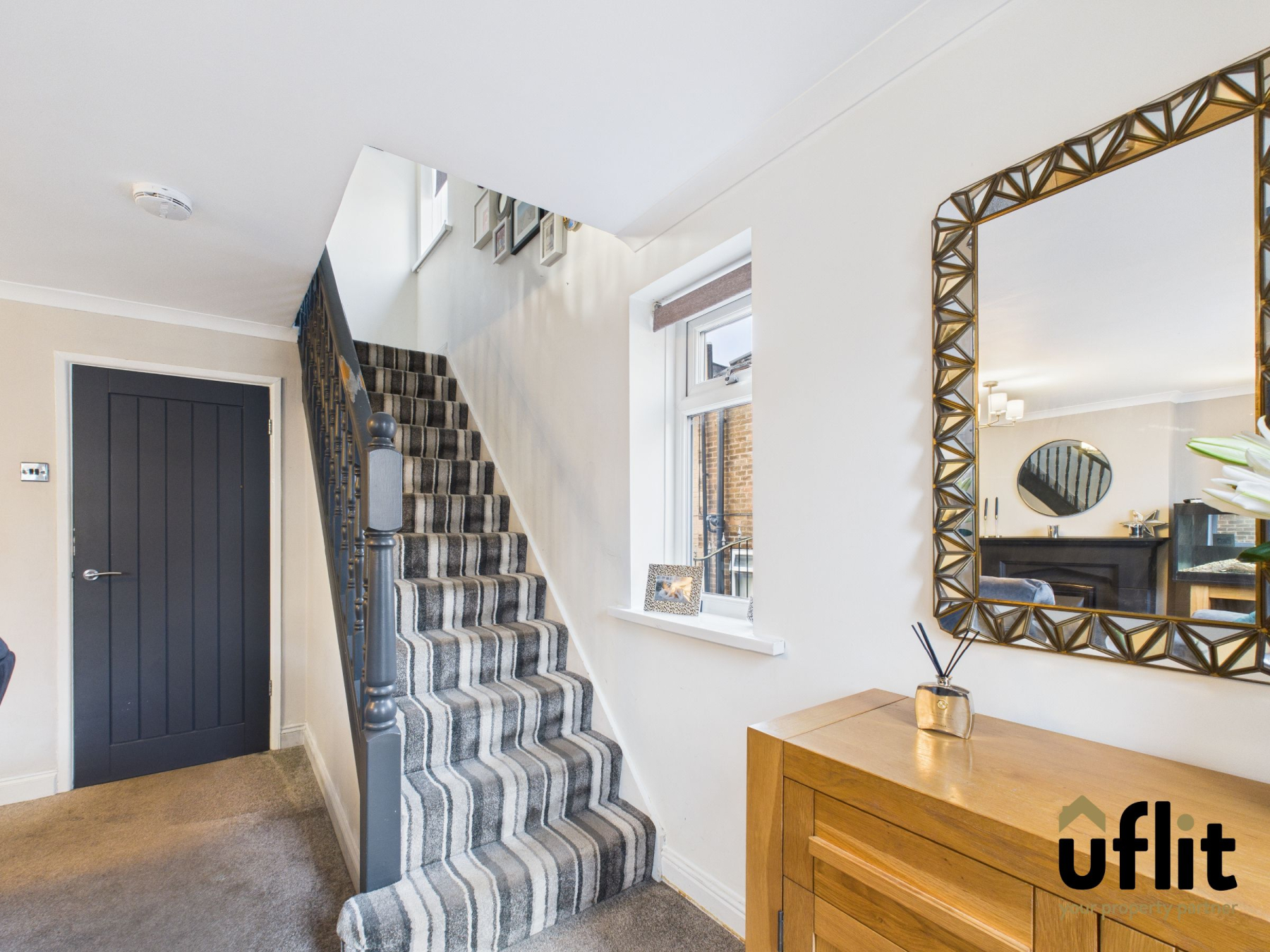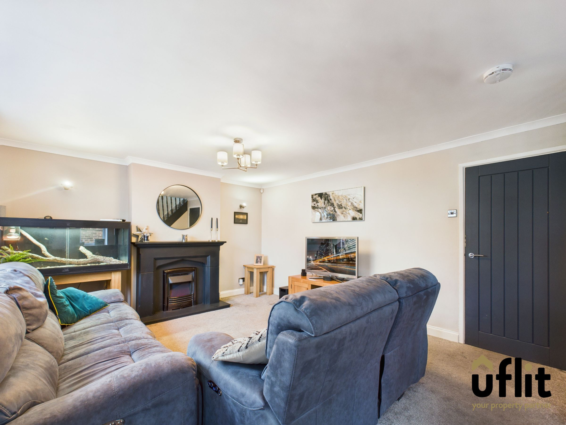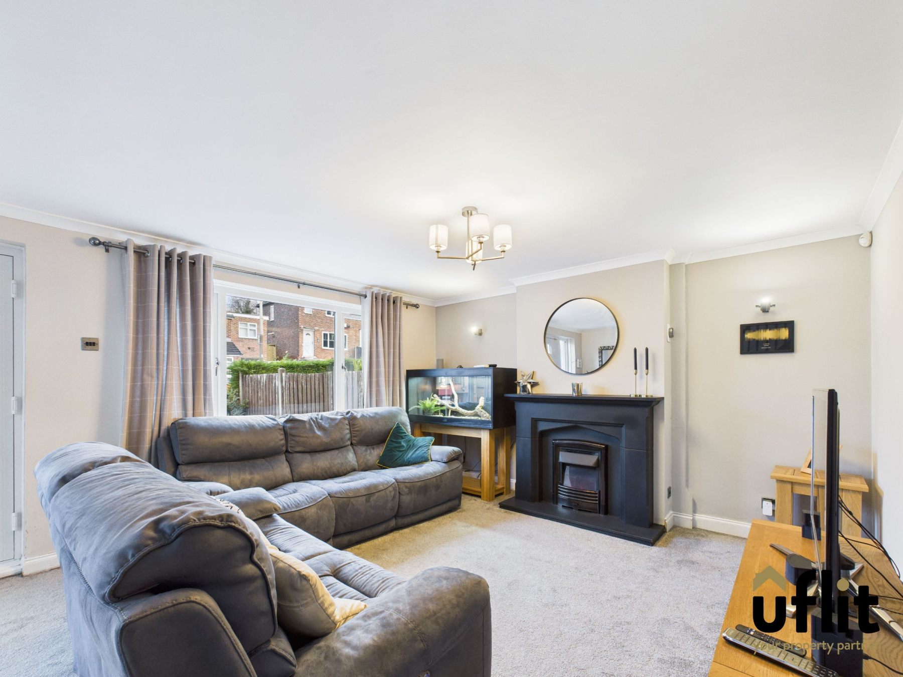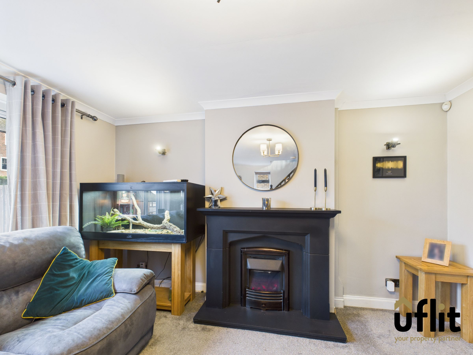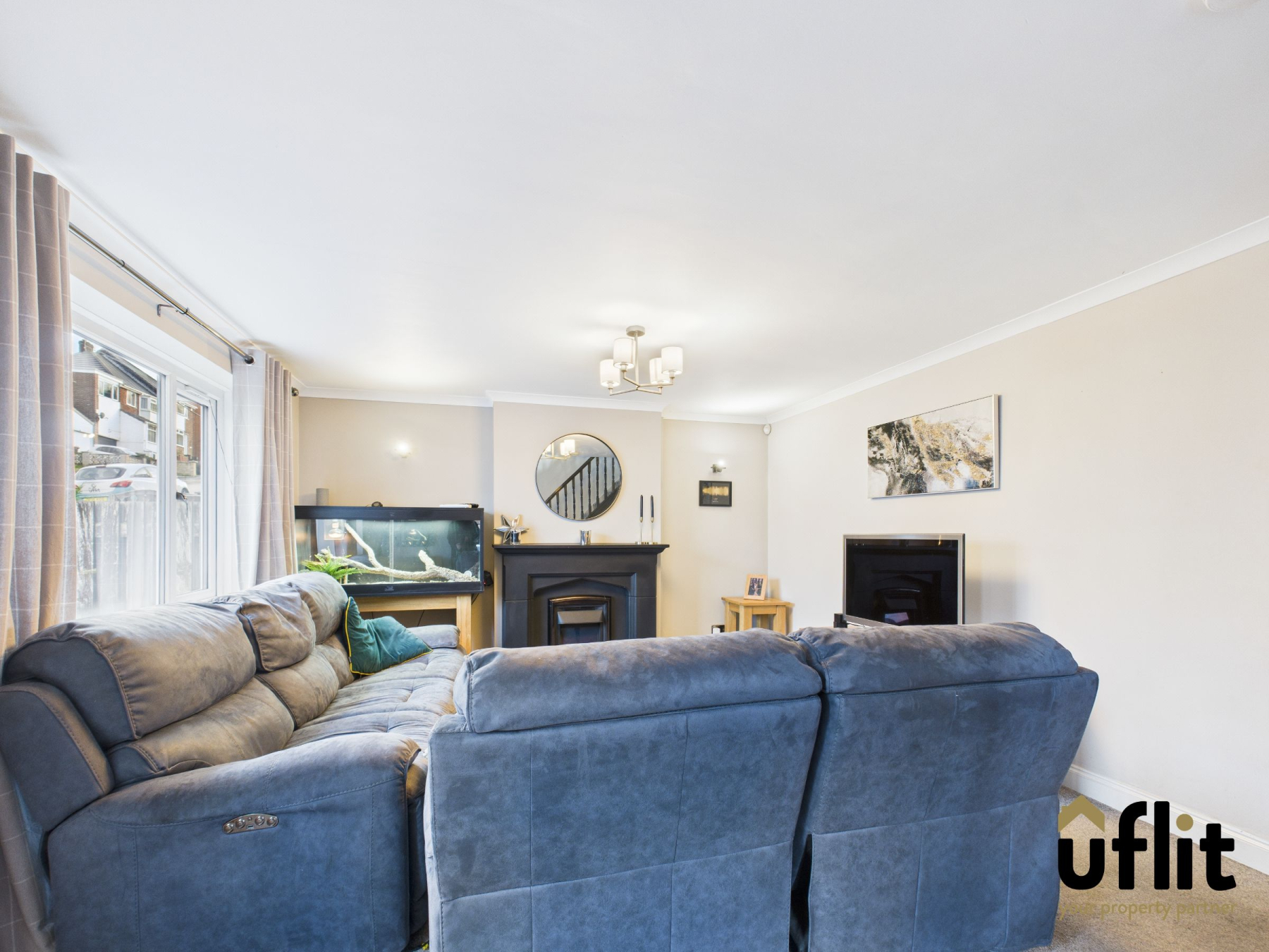 The living room is a warm and inviting space, featuring a stylish electric fire with surround as its focal point. The room is carpeted for comfort and benefits a radiator, a side window and a large front facing window that floods the room with light. Stairs rise to the first floor, while an internal door provides access to the kitchen diner.
