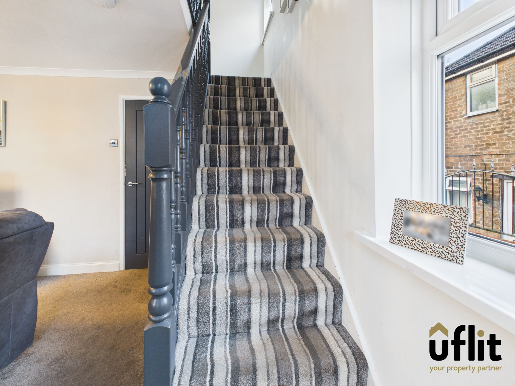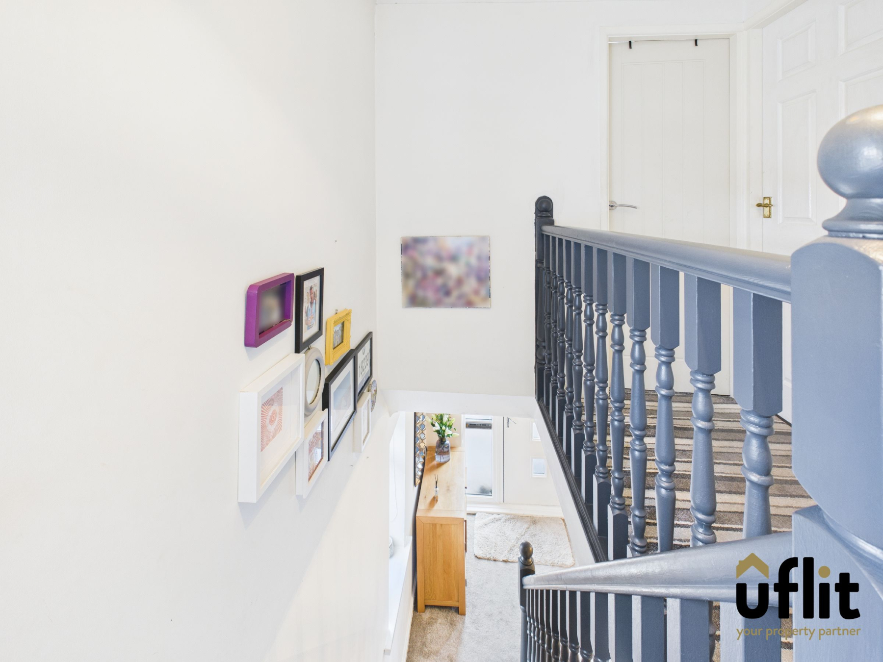 Stairs from the living room lead to the first floor, where a carpeted landing with a side window gives access to the family bathroom and all three bedrooms.