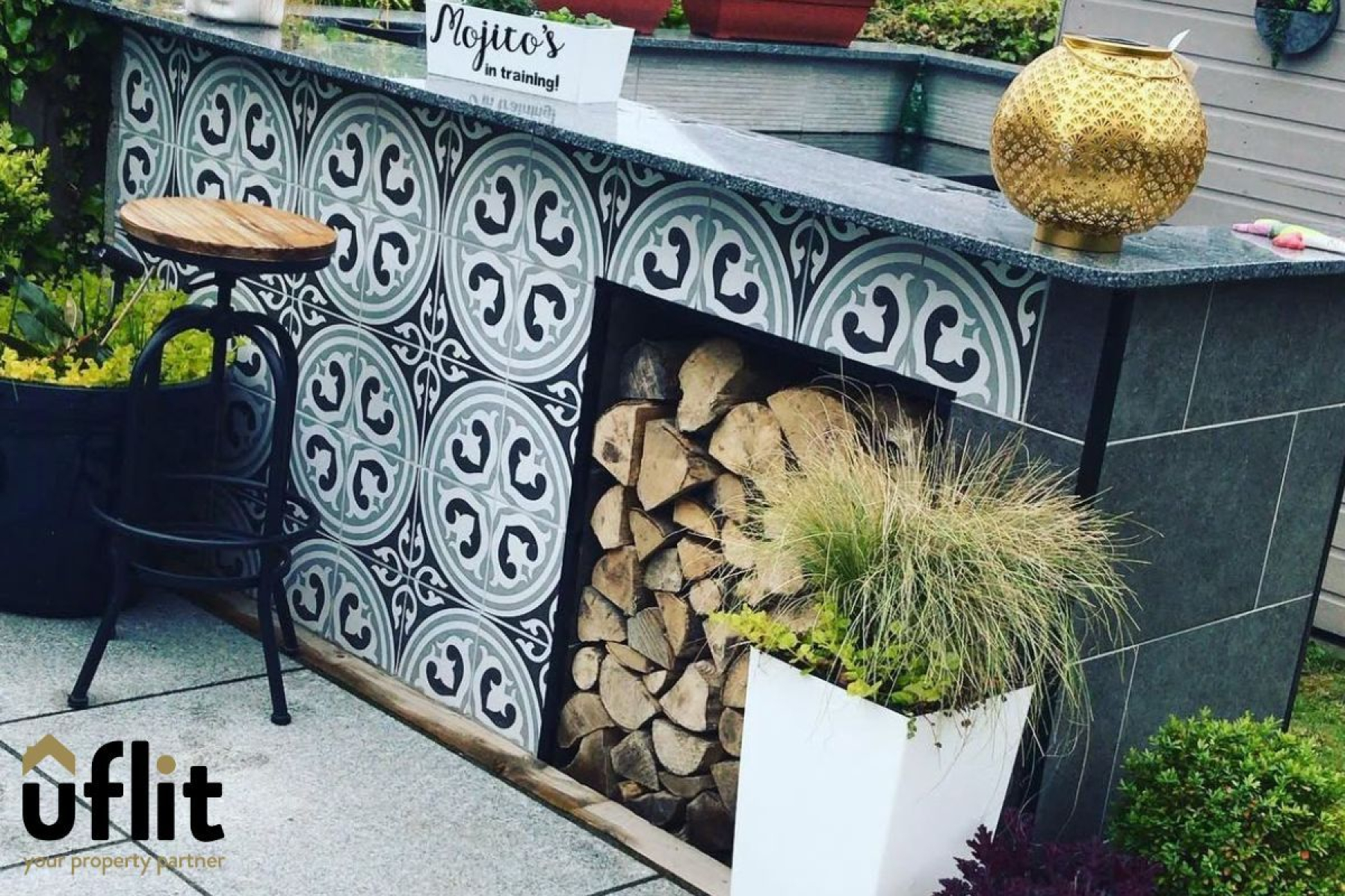 To the rear is a fully enclosed, tiered garden designed for both relaxation and entertaining. The garden features a paved area, a lawned section, and an Indian granite seating area. A standout feature is the garden kitchen with granite worktops, creating the perfect outdoor entertaining space.