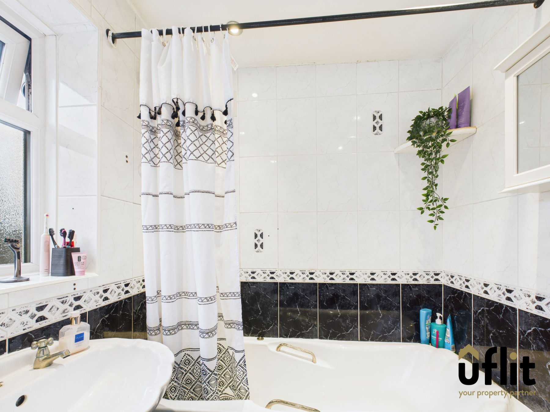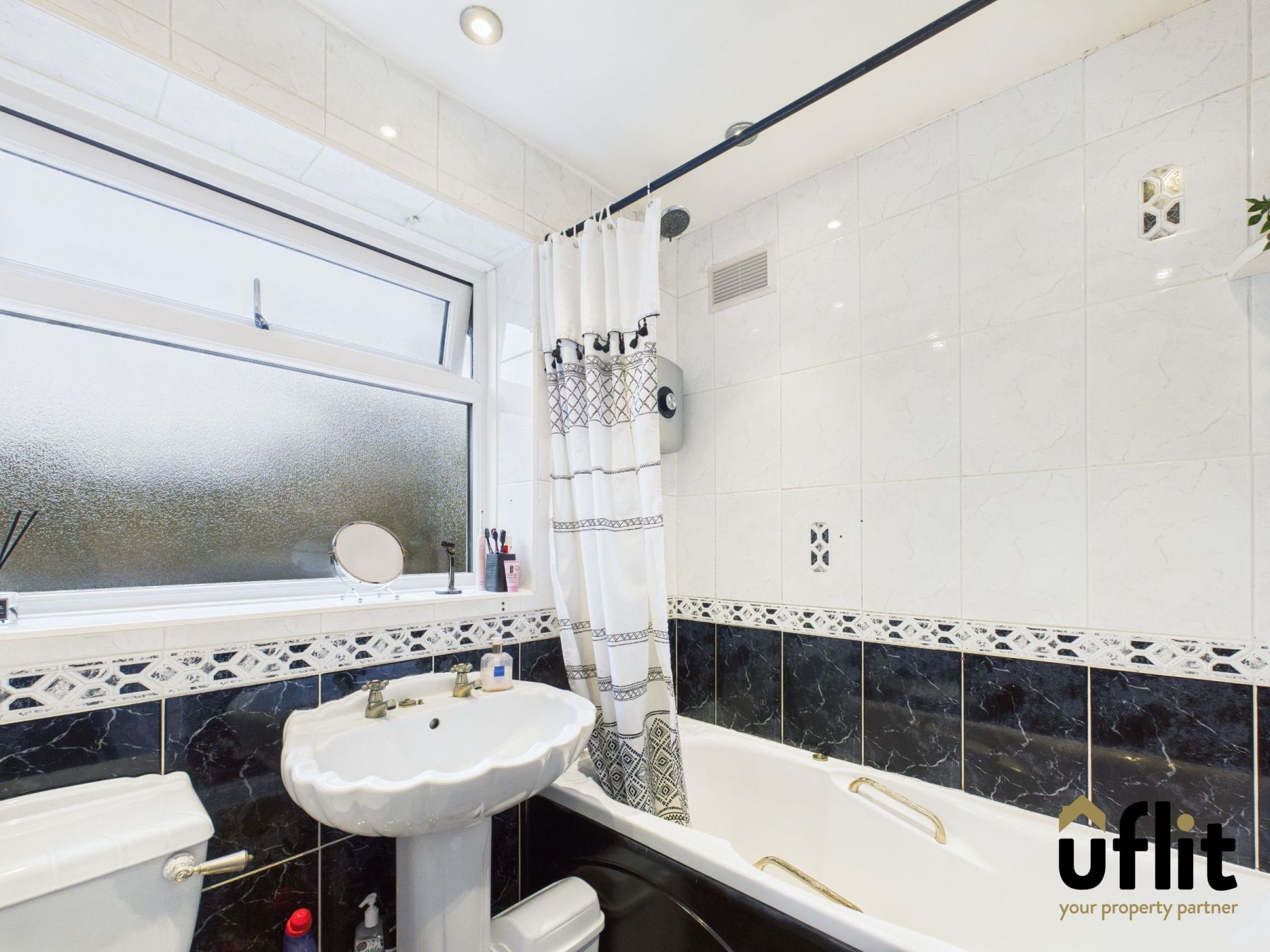 The family bathroom is finished to a modern standard, featuring a low-level WC, floor-standing wash basin and a bath with overhead shower. Fully tiled floors and walls provide a clean, contemporary feel, while a rear facing window allows for ventilation and natural light.