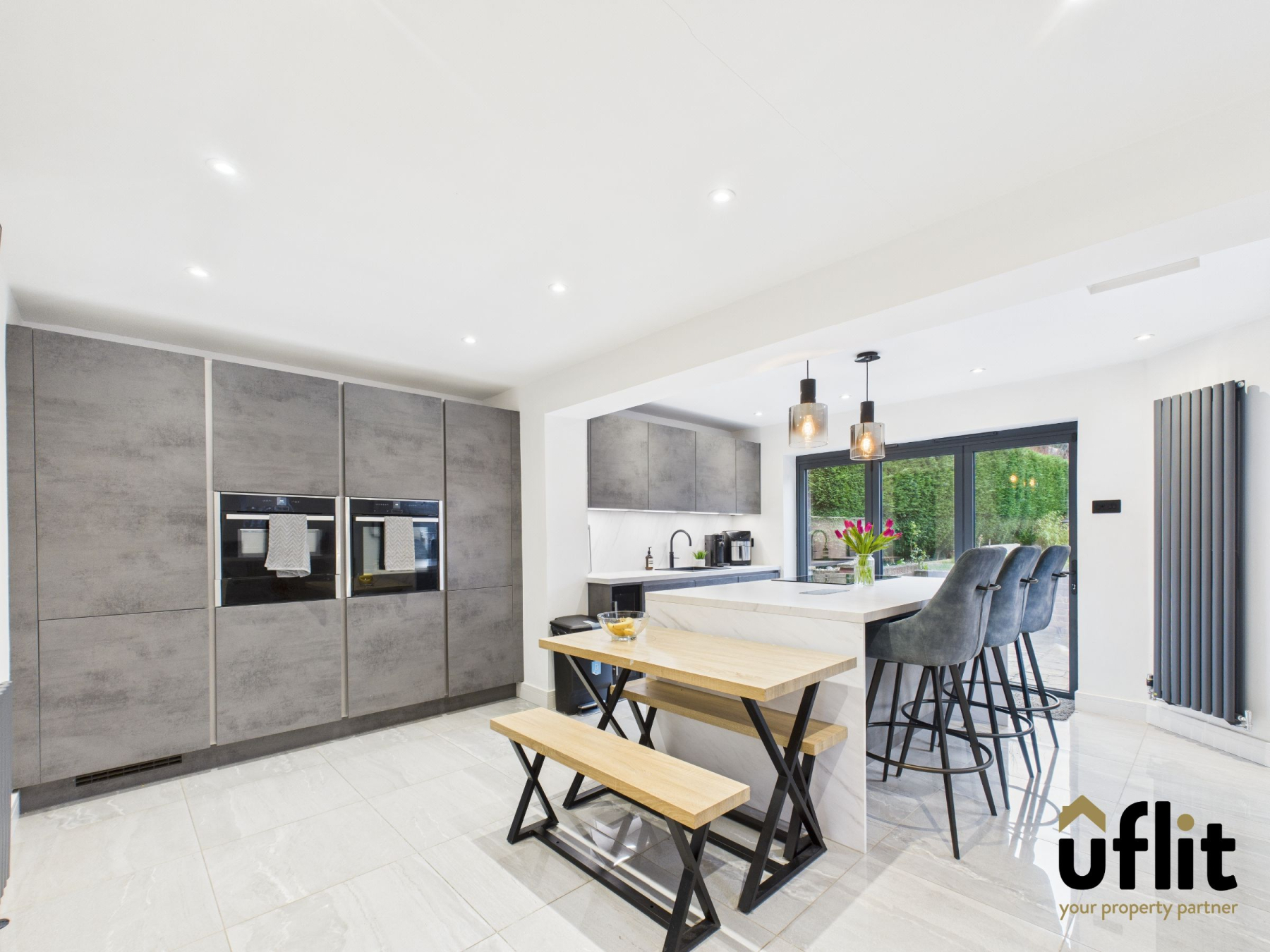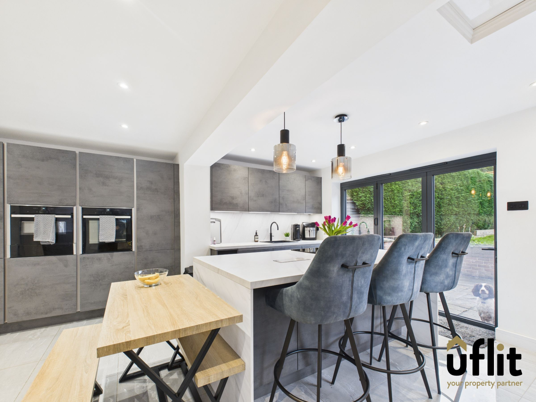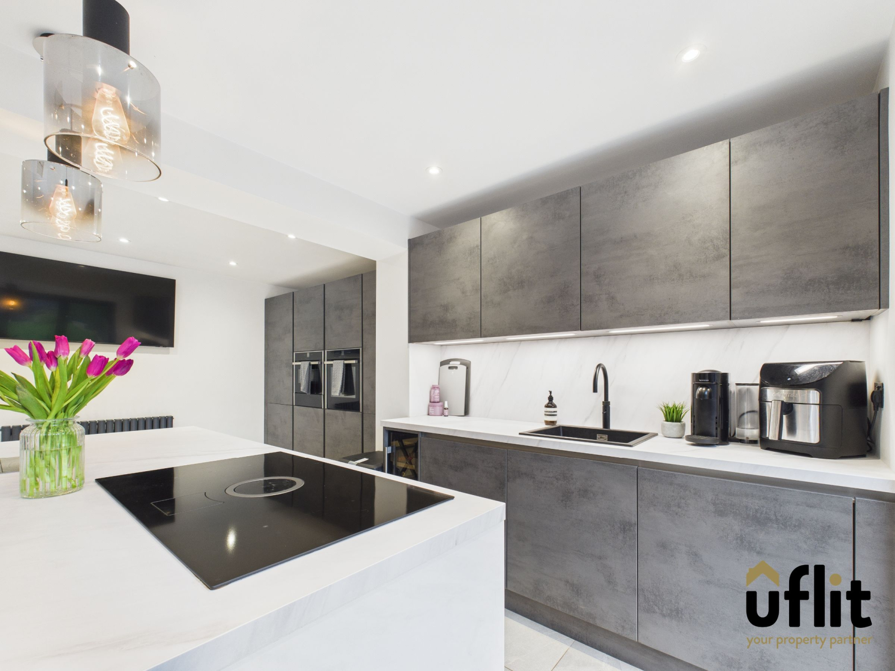 The heart of the home is the impressive open-plan kitchen diner, designed for both everyday family life and entertaining. Featuring a large central island, high-spec integrated NEFF appliances, and bi-fold doors opening onto the rear garden, this space creates a seamless connection between indoor and outdoor living. Complementing this is a welcoming living room, ideal for relaxing evenings, along with three well-proportioned bedrooms and a modern family bathroom to the first floor.