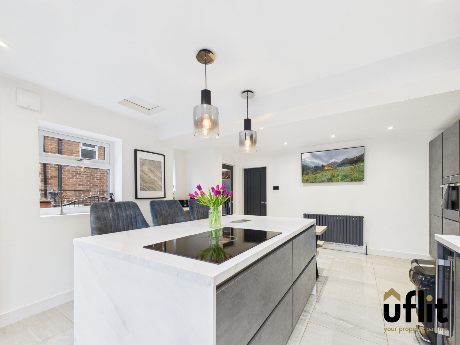 This impressive open plan kitchen diner has been designed with both style and functionality in mind. Tiled flooring and spotlights create a sleek finish, complemented by modern wall and base units and marble-effect laminate worktops with matching splash backs. A large central island houses an induction four-point hob with built-in extractor and a convenient pop-up socket, making it perfect for entertaining. Integrated appliances include NEFF oven, combi oven and microwave with heated drawer, dishwasher, washing machine, fridge freezer, wine cooler, and a full-length larder unit. A cooker boiler tap adds a touch of luxury, while a full-length radiator ensures comfort. A storage and larder cupboard provides additional practicality and includes an external door offering side access. Bi-fold doors open seamlessly onto the rear garden, and two side windows allow further natural light to pour in.