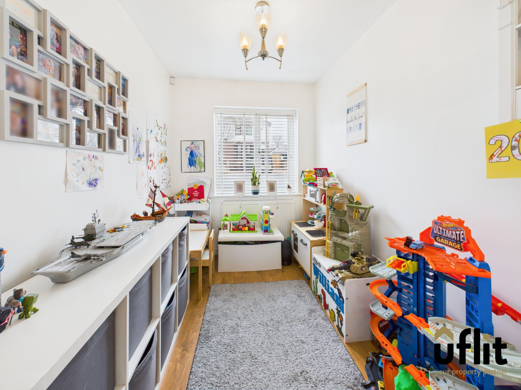Extended to create a generous and versatile room, the dining room or playroom features wooden laminate flooring and a radiator. French doors open directly onto the rear garden, allowing plenty of natural light to flow through and providing a seamless connection between indoor and outdoor living. This flexible space is perfect for family meals, entertaining or children's play.