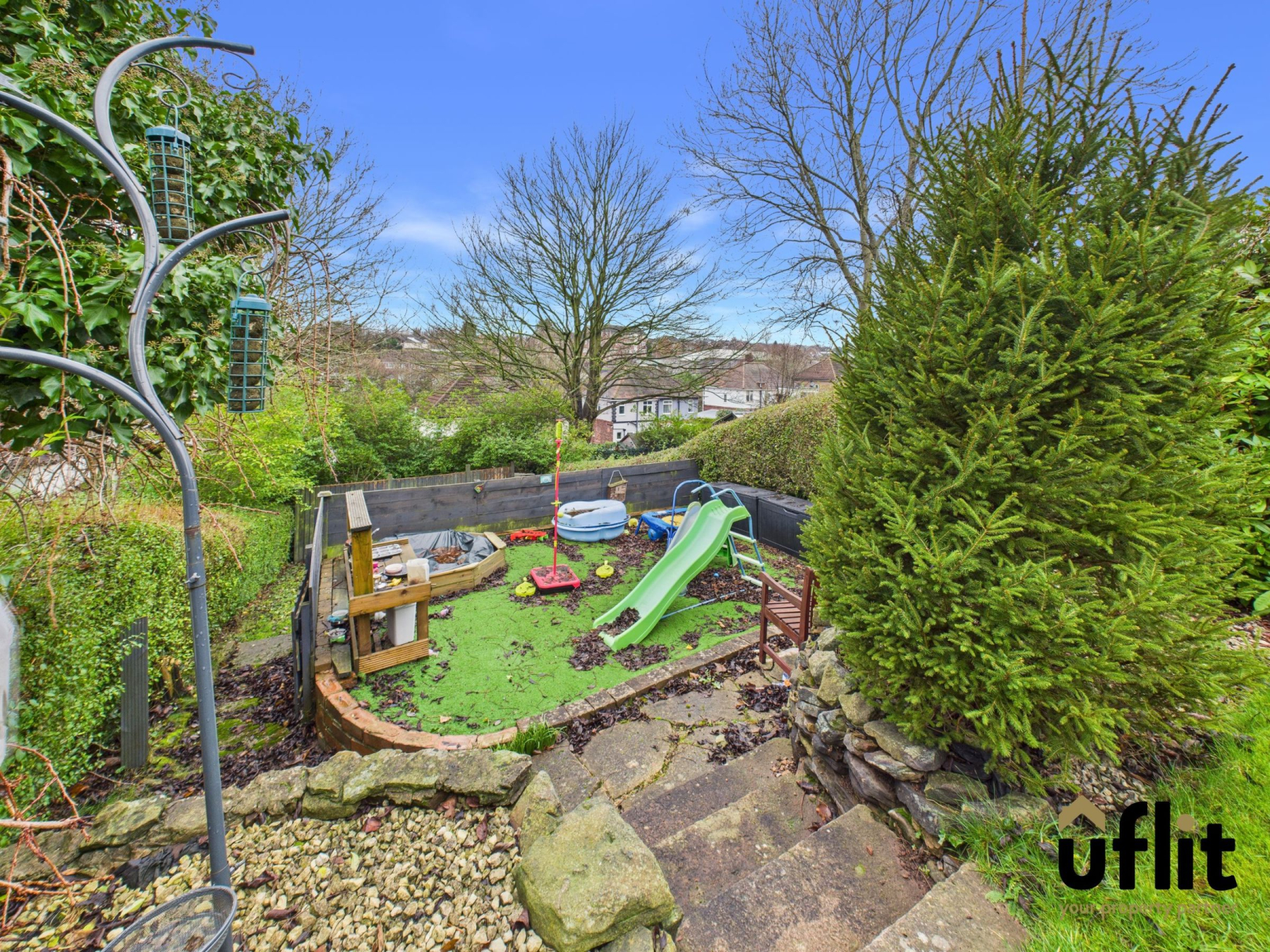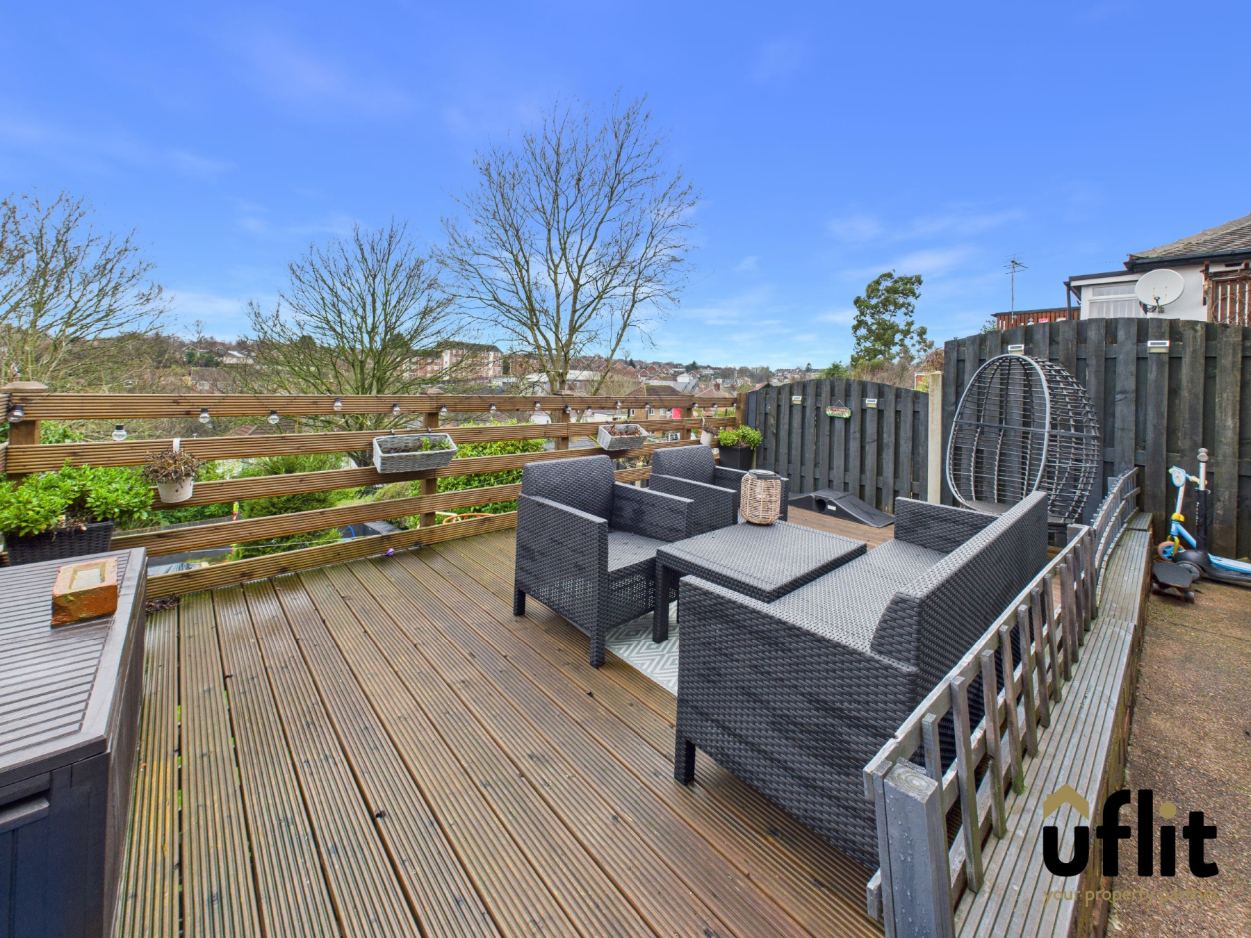 Externally, the property offers a driveway providing off-road parking for two vehicles. To the rear is a fully enclosed, four-tier garden featuring a combination of seating areas, lawned sections and play space, ideal for families and entertaining.