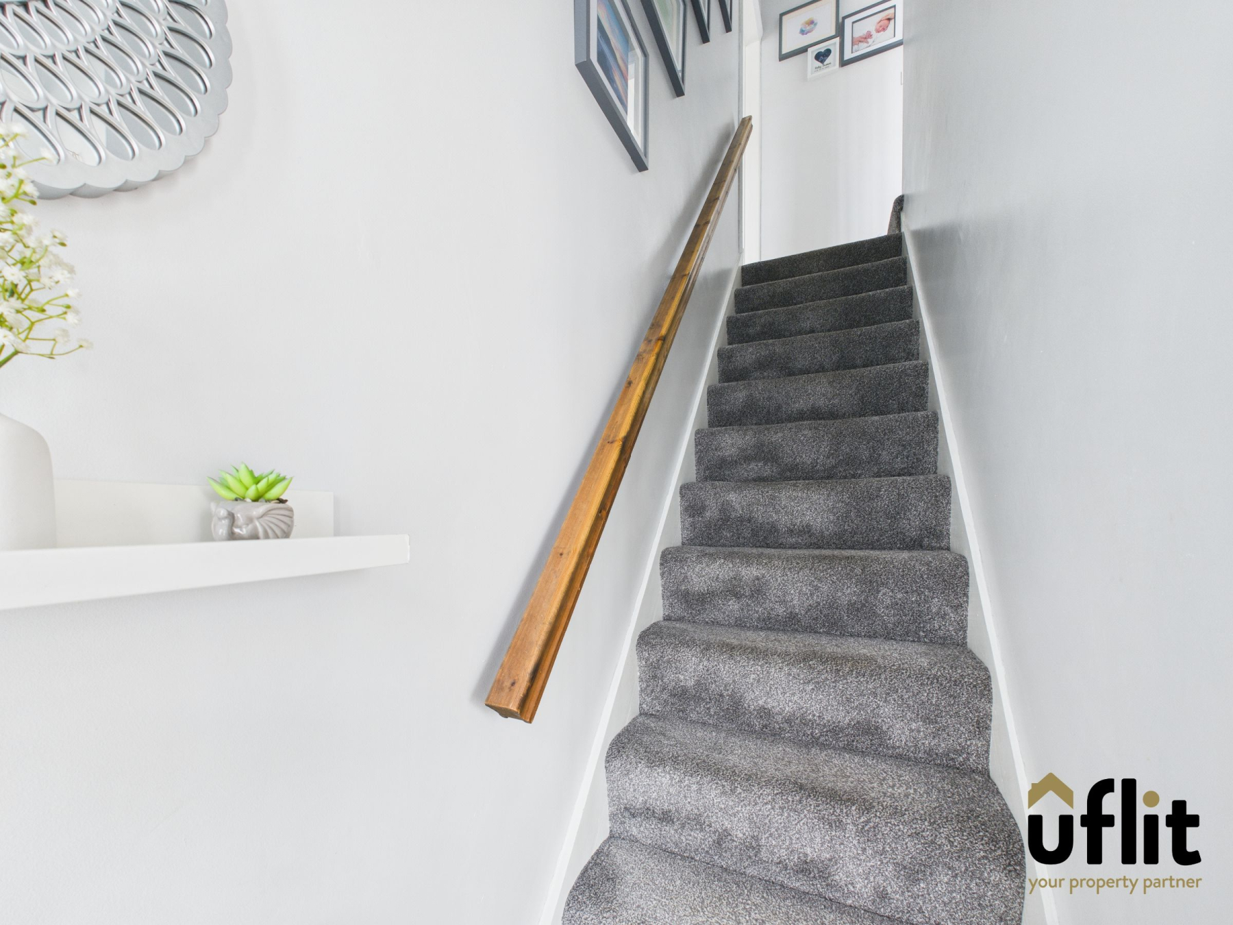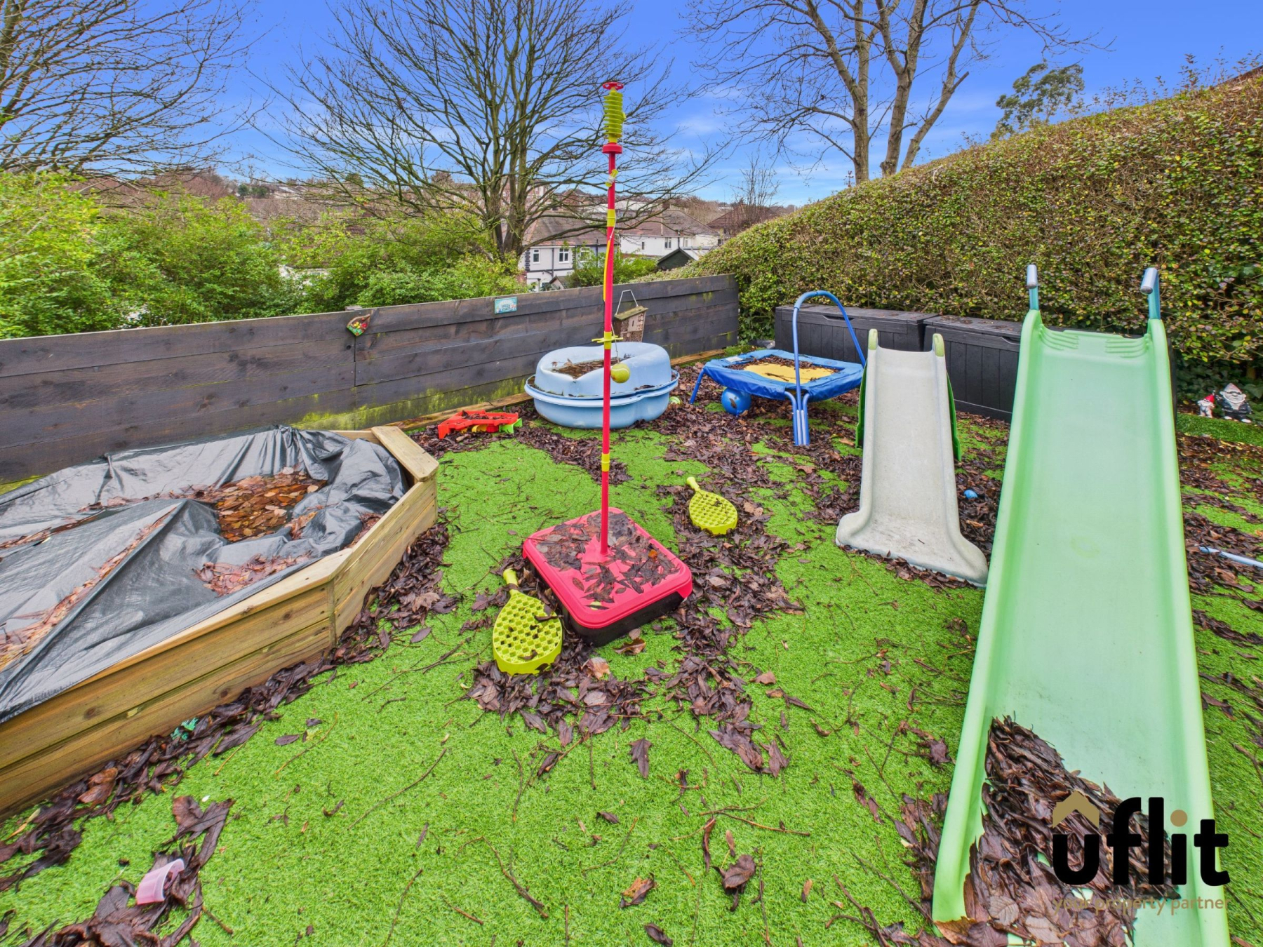 The rear garden is arranged over four tiers, offering a variety of usable outdoor spaces. The first tier features a paved and decked seating area accessed directly from the French doors, ideal for outdoor dining. The second tier is laid to lawn, followed by an astro turf play area with a stone section for shrubbery. The fourth tier is laid to grass. Fully enclosed, the garden provides privacy and a safe environment for children and pets.