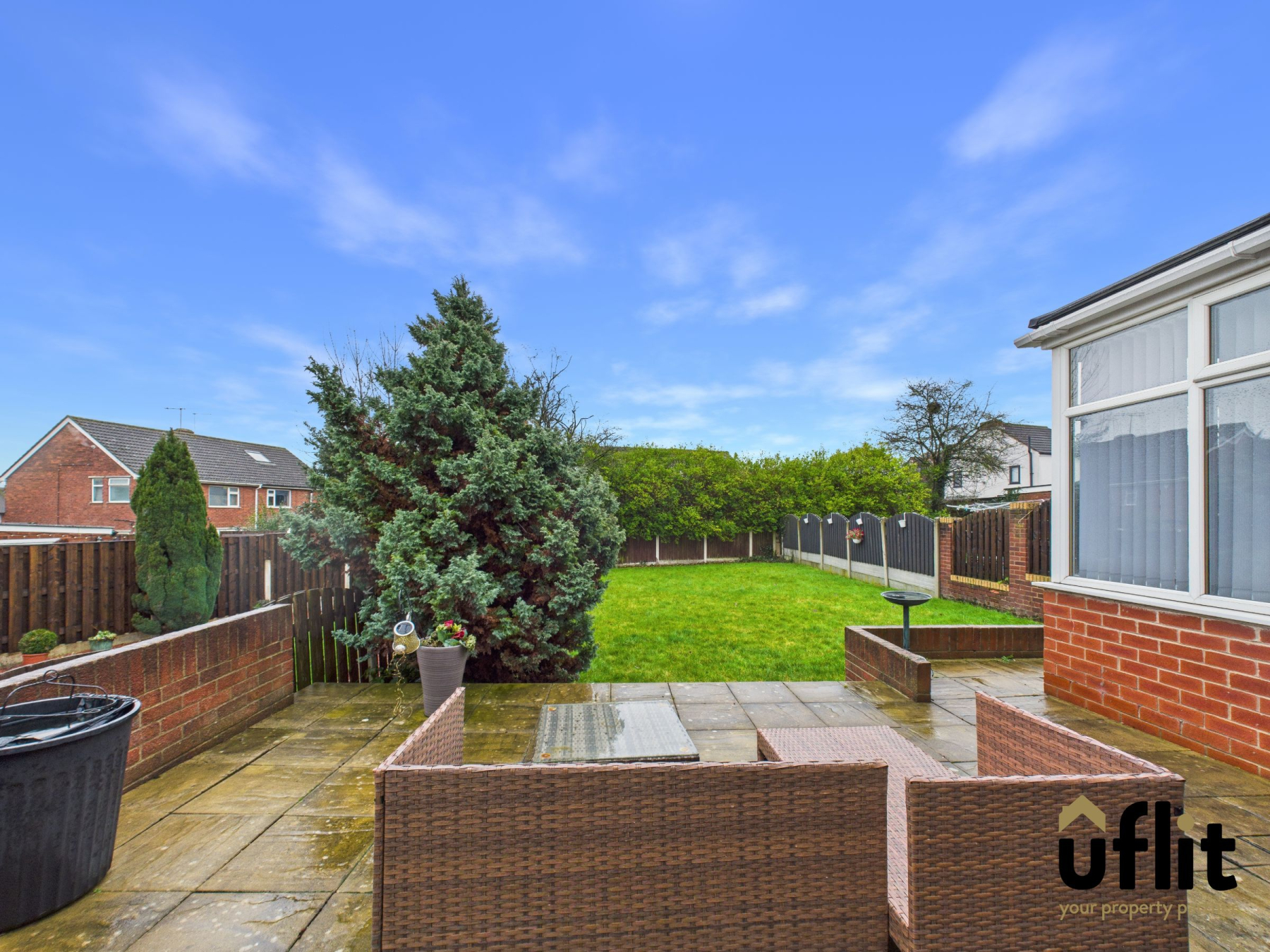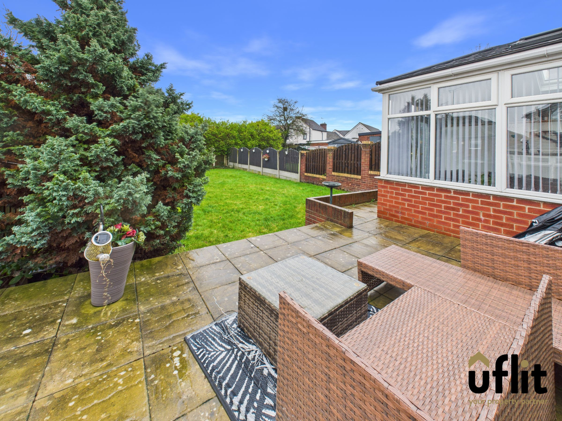 To the rear is a south-facing, enclosed garden that is neat, flat and low maintenance. The outdoor space includes a patio area ideal for seating and entertaining, along with a well-kept lawn.