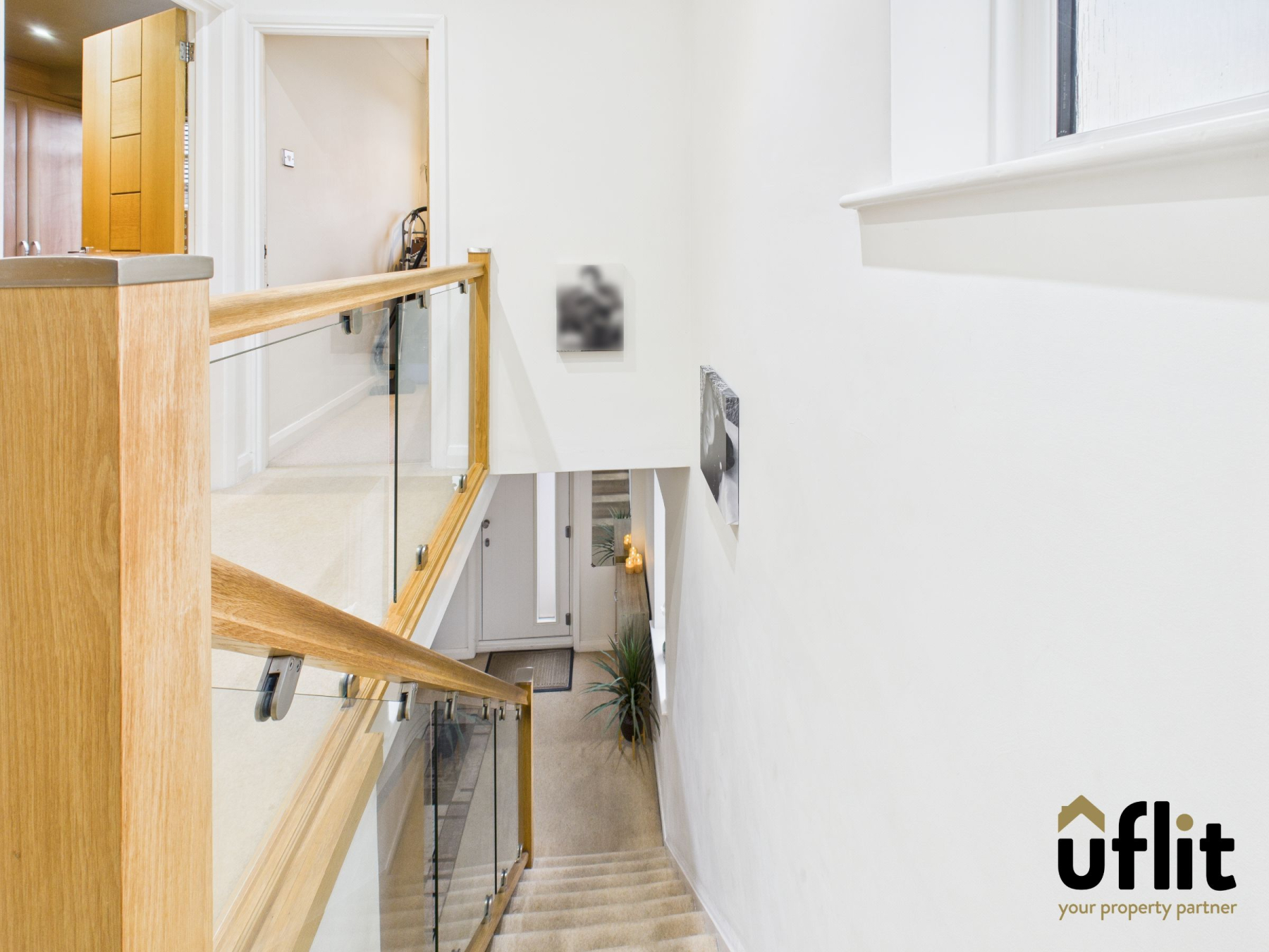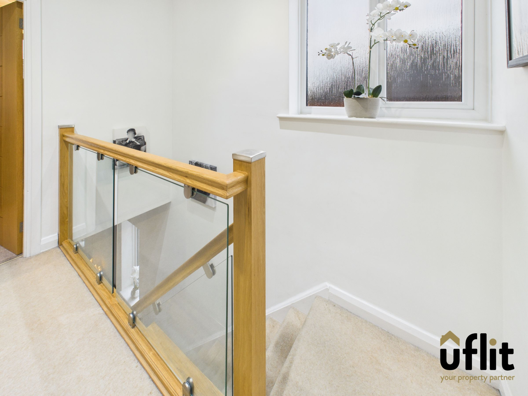 The landing is accessed via carpeted stairs and benefits from a window at the top of the staircase, spotlights and a modern glass balustrade, creating a light and contemporary feel.