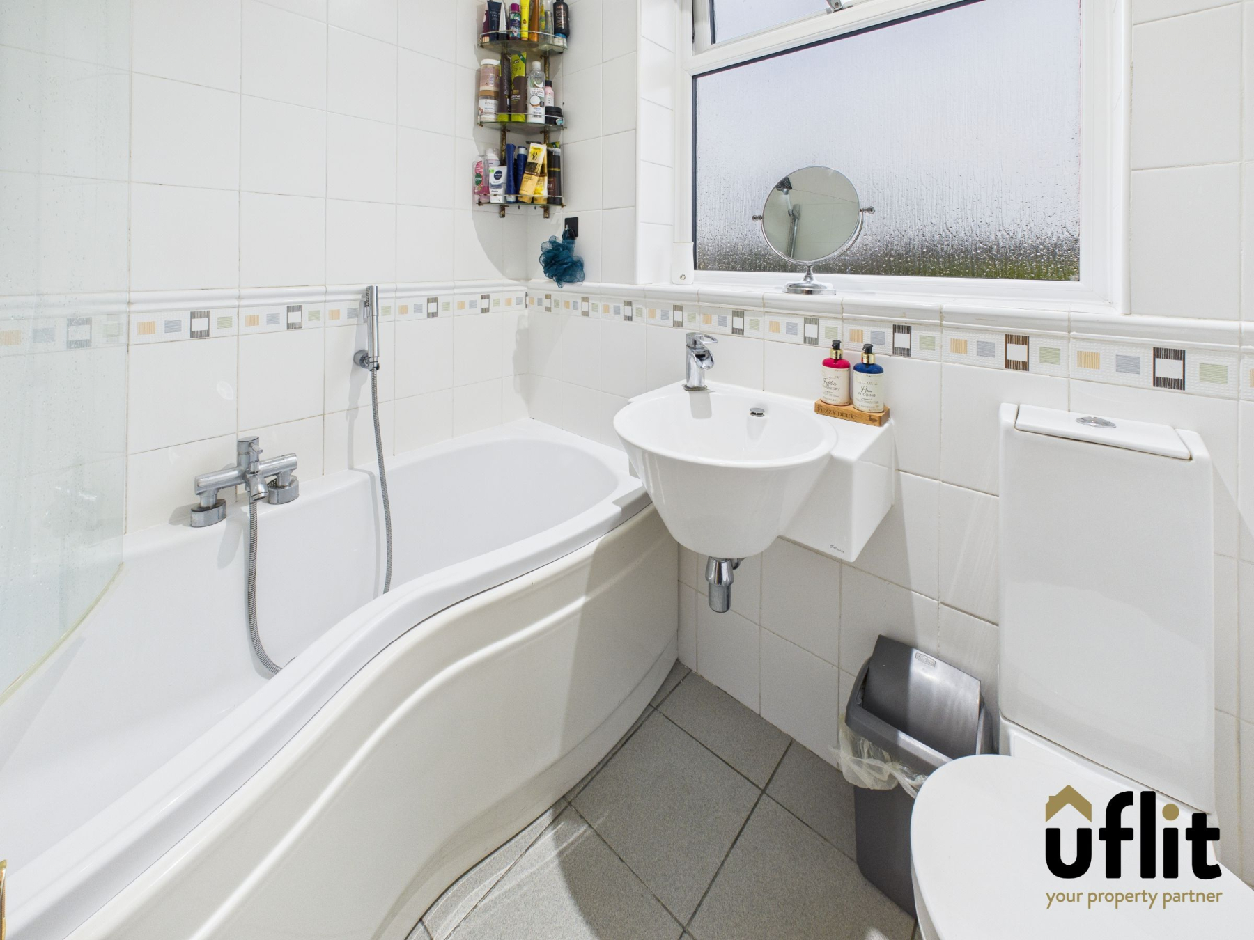 The family bathroom is fully tiled and fitted with a modern white suite, including a bath with overhead shower, floating wash basin and low-level WC, with a rear-facing window allowing natural light and ventilation.